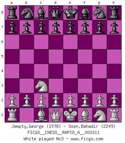 Last move : 1/2-1/2 2025 August 21 9:44:42 [Event "FICGS__CHESS__RAPID_A__000311"] [Site "FICGS"] [Date "2025.07.13"] [Round "1"] [White "Jempty,George"] [Black "Ozen,Bahadir"] [Result "1/2-1/2"] [WhiteElo "1978"] [BlackElo "2249"] 1.Nc3 d5 2.d4 Nf6 3.Bf4 e6 4.Nb5 Bb4+ 5.c3 Ba5 6.e3 a6 7.Na3 O-O 8.Nf3 Nbd7 9.Be2 Ne4 10.Nd2 Nxd2 11.Qxd2 c6 12.O-O Re8 13.Rfd1 e5 14.dxe5 Nxe5 15.Bxe5 Rxe5 16.Nc4 Re8 17.Nxa5 Qxa5 18.Qc2 Qc7 19.a4 g6 20.Bf3 Bf5 1/2-1/2 Follow this game move after move (download)I like to say that Bobby Fischer was the greatest player ever. But what made Fischer a genius was his ability to blend an American freshness and pragmatism with Russian ideas about strategy. (Bruce Pandolfini) Gott hat gewollt, dass ich Champion werde. (Surab Azmajparaschvili) Aquellos que dicen entender al Ajedrez, no entienden nada. (Robert Hubner) Il s'avisa de me proposer d'apprendre les échecs qu'il jouait un peu... me voilà forcené des échecs. J'achète un échiquier, je m'enferme dans ma chambre, j'y passe des jours et des nuits à vouloir apprendre par cur toutes les parties. (Jean-Jacques Rousseau, Confessions) I live to kill Traxler counterattack. (Ilmars Cirulis)