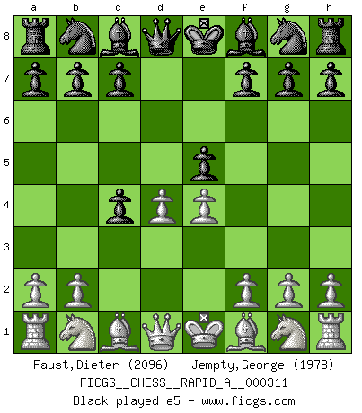 Last move : 0-1 2025 August 27 9:27:58 [Event "FICGS__CHESS__RAPID_A__000311"] [Site "FICGS"] [Date "2025.07.13"] [Round "1"] [White "Faust,Dieter"] [Black "Jempty,George"] [Result "0-1"] [WhiteElo "2096"] [BlackElo "1978"] 1.d4 d5 2.c4 dxc4 3.e4 e5 4.Nf3 Bb4+ 5.Bd2 Bxd2+ 6.Qxd2 exd4 7.Nxd4 Ne7 8.Nc3 O-O 9.Rd1 c5 10.Ndb5 Qxd2+ 11.Rxd2 a6 12.Nd6 b5 13.a4 b4 14.Nd1 c3 15.bxc3 Be6 16.f4 Nd7 17.Rb2 Nb6 18.f5 Bd7 19.a5 Na4 20.Rd2 Ra7 21.cxb4 cxb4 22.Bc4 Bb5 23.Bxb5 axb5 24.f6 gxf6 25.Ne3 b3 26.O-O b2 27.Ng4 Rc7 28.Nxf6+ Kh8 29.Rd3 Rc1 30.Rb3 Ra8 31.Nxf7+ Kg7 32.Nh5+ Kf8 33.Nd6 Rxf1+ 34.Kxf1 Nc6 0-1 Follow this game move after move (download)The Chess pieces are the block alphabet which shapes thoughts; and these thoughts, although making a visual design on the chessboard, express their beauty abstractly, like a poem. (Marcel Duchamp) In Buenos Aires ist es nicht mein vorrangiges Ziel ein starkes Turnier zu organisieren, sondern ein Turnier für Gentlemen. Ich würde nie Kamsky einladen. Ich mag keine Probleme. (Miguel Najdorf) Cada Peón es potencialmente una Reina. (James Mason) Les échecs, c'est la lutte contre l'erreur. (Johannes Zukertort) Wisdom doesn't necessarily come with age. Sometimes age just shows up all by itself. (Tom Watson)
