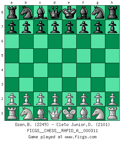 Last move : 1-0 2025 August 18 20:55:35 [Event "FICGS__CHESS__RAPID_A__000311"] [Site "FICGS"] [Date "2025.07.13"] [Round "1"] [White "Ozen,Bahadir"] [Black "Cleto Junior,Dirceu"] [Result "1-0"] [WhiteElo "2249"] [BlackElo "2101"] 1.d4 Nf6 2.c4 g6 3.g3 Bg7 4.Bg2 O-O 5.Nf3 d6 6.O-O Nc6 7.Nc3 a6 8.Bf4 Rb8 9.Rc1 Bd7 10.a3 h6 11.d5 Na5 12.Nd2 e5 13.Be3 b5 14.cxb5 axb5 15.b4 Nb7 16.Nb3 Ra8 17.Ra1 Nh5 18.Ra2 f5 19.Bc1 Qb8 20.e3 Nd8 21.Na5 e4 22.Ne2 Nf6 23.Rc2 Kh7 24.Bb2 Ng4 25.Bxg7 Kxg7 26.Qc1 Ra7 27.Nd4 Re8 28.Qa1 Nf6 29.f4 exf3 30.Rxf3 Re5 31.Rf1 1-0 Follow this game move after move (download)If cunning alone were needed to excel, women would be the best Chess players. (Albin) Es gibt nur zwei wahre Schachgenies - das andere war Wilhelm Steinitz, der Weltmeister von 1872 bis 1894. (Robert James Fischer) Hasta este punto, las blancas han seguido un análisis bien conocido. Pero ahora el hace un error fatal: empieza a usar su propia cabeza. (Siegbert Tarrasch) Le pion, dans sa simplicité, marche droit devant lui, mais lorsqu'il prend, il le fait obliquement? Ainsi l'homme, tant qu'il reste pauvre, marche dans la droiture et vit honnêtement, mais lorsqu'il recherche les honneurs, il flatte, se parjure et, par les voies obliques, cherche une position supérieure sur l'échiquier du monde. (Jean de Galles) Don't be discouraged. It's often the last key in the bunch that opens the lock. (Author unknown)