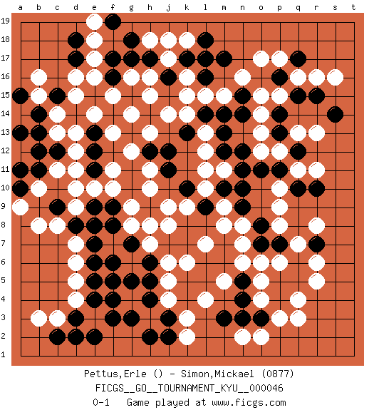Last move : 0-1 2008 March 7 5:52:25 [Event "FICGS__GO__TOURNAMENT_KYU__000046"] [Site "FICGS"] [Date "2007.10.05"] [Round "1"] [Black "Pettus,Erle"] [White "Simon,Mickael"] [Result "0-1"] [Rating 2 "0877"] 1.p14 d4 2.d3 c3 3.e4 d5 4.e5 d6 5.e6 q4 6.p4 d16 7.e7 d7 8.q5 q3 9.f3 q16 10.d2 o17 11.f5 r5 12.d8 c8 13.c9 d9 14.e8 b8 15.b9 d10 16.c10 c11 17.b11 a9 18.a10 b10 19.e2 r11 20.c2 p3 21.p5 r8 22.c9 o4 23.e9 e10 24.a11 g4 25.g5 k3 26.h4 h3 27.g3 j4 28.f4 j5 29.h2 j8 30.j3 f10 31.h5 j6 32.h6 h7 33.b12 c13 34.b13 c14 35.b14 b15 36.a15 a14 37.a13 b16 38.c12 d12 39.c15 d15 40.d14 d13 41.e13 e14 42.f14 f15 43.e12 g14 44.e11 d11 45.f9 h10 46.g10 g9 47.g11 h11 48.h9 g8 49.g7 j9 50.f8 h8 51.f6 k2 52.j2 b3 53.k4 l4 54.k5 k6 55.l5 m5 56.l6 l7 57.m6 n6 58.m7 m8 59.n5 n7 60.n4 o5 61.o3 o6 62.h12 g12 63.g13 f11 64.j11 h13 65.j12 j14 66.k13 k14 67.l14 l15 68.m13 m15 69.l9 m9 70.m10 l12 71.m12 l13 72.m14 l11 73.k10 m11 74.n11 l10 75.n10 k9 76.n9 o13 77.n15 n16 78.q15 o15 79.n14 o14 80.p16 p17 81.q17 r16 82.r15 s16 83.s14 r13 84.p13 o12 85.n12 p15 86.p11 p12 87.q12 q13 88.o11 q11 89.q10 p9 90.r10 p10 91.l16 k15 92.j16 k16 93.k17 l17 94.l18 k18 95.m17 j17 96.l17 j18 97.g15 f13 98.f16 h16 99.f17 g16 100.g18 e18 101.d17 e17 102.f19 e16 103.d18 e19 104.h17 h18 105.g17 h15 106.o8 p8 107.p7 q7 108.r7 r6 109.q6 p6 110.o7 n8 111.m3 o2 112.n3 n2 0-1 Here are the names of the openings (joseki) played in the four corners : Corner d4 : d4 d3 Hoshi (Hwajeom, Seongjeom, Xingwei`) 4-4 Point. The star or hoshi (4-4) point, emphasizing influence at the potential expense of territory. Corner q4 : q4 p4 Hoshi (Hwajeom, Seongjeom, Xingwei`) 4-4 Point. The star or hoshi (4-4) point, emphasizing influence at the potential expense of territory. Corner q16 : p14 q16 This joseki is unknown. A weak or weird move has probably been played in this corner. Player White won this Go (weiqi, baduk) game. Follow this game move after move (download)There are players who don't accept exchange: they play many moves that perpetuate a previous state of the game. (Pierre Audouard) Nothing is more important for teaching us to understand the concepts we have than constructing fictitious ones. (Ludwig Wittgenstein)
