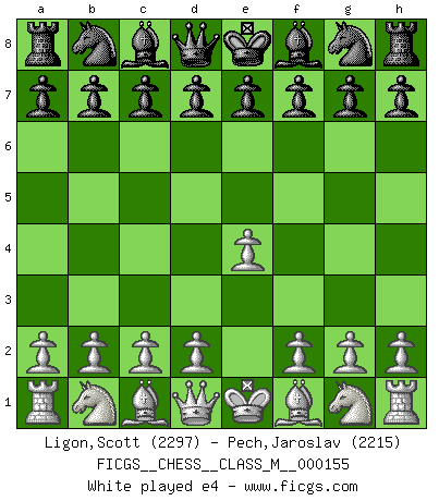 Last move : 1-0 2025 October 4 11:4:5 [Event "FICGS__CHESS__CLASS_M__000155"] [Site "FICGS"] [Date "2025.07.13"] [Round "1"] [White "Ligon,Scott"] [Black "Pech,Jaroslav"] [Result "1-0"] [WhiteElo "2297"] [BlackElo "2215"] 1.e4 e5 2.Nf3 Nc6 3.Bb5 Nf6 4.O-O Nxe4 5.Re1 Nd6 6.Nxe5 Be7 7.Bf1 Nxe5 8.Rxe5 O-O 9.Nc3 Ne8 10.Nd5 Bd6 11.Re1 c6 12.Ne3 Bc7 13.Nf5 d5 14.Ne7+ Kh8 15.Nxc8 Rxc8 16.g3 Qd7 17.d3 1-0 This chess game has been lost on time (started : 2025.07.13 20:25:11) Follow this game move after move (download)Chess teaches you to control the initial excitement you feel when you see something that looks good and it trains you to think objectively when you're in trouble. (Stanley Kubrick) Ohne ihre Erfolge schmälern zu wollen würde ich sagen Petrosian, Spassky und Karpov verdanken ihre Siege ihren Trainern - Boleslavsky, Bondarevsky und Furman. (Mikhail Moiseyevich Botvinik) El Ajedrez no es una pizca de inferior al violín, y tenemos un gran número de violinistas profesionales. (Mikhail Botvinnik) A chaque perte on perd un peu de soi. (Joël Lautier) Man is still the most extraordinary computer of all. (John F. Kennedy)