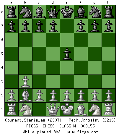 Last move : 1-0 2025 August 25 23:3:43 [Event "FICGS__CHESS__CLASS_M__000155"] [Site "FICGS"] [Date "2025.07.13"] [Round "1"] [White "Gounant,Stanislas"] [Black "Pech,Jaroslav"] [Result "1-0"] [WhiteElo "2307"] [BlackElo "2215"] 1.b3 e5 2.Bb2 Nc6 3.e3 Nf6 4.Bb5 e4 5.f3 a6 6.Bxc6 dxc6 7.Nc3 Bf5 8.d3 exd3 9.e4 Be6 10.Qxd3 1-0 Follow this game move after move (download)If Chess is a science, it's a most inexact one. If Chess is an art, it is too exacting to be seen as one. If Chess is a sport, it's too esoteric. If Chess is a game, it's too demanding to be just a game. If Chess is a mistress, she's a demanding one. If Chess is a passion, it's a rewarding one. If Chess is life, it's a sad one. (Unknown) Mutter, ich bin eben Ex-Weltmeister geworden. --beim nach Hause Kommen nach dem Verlust des WM-Titels an Mihail Botvinnik -- (Mikhail Nekhemyevich Tal) Cuando estes solo, cuando te sientas un extraño en el mundo, juega al Ajedrez. Esto levantará tu espiritu y será tu consejero de guerra. (Aristóteles) Les réformistes prétendent que les progrès de la théorie conduiront à la disparition des échecs, et qu'il faut, pour leur rendre vie, en remanier les règles. En réalité, qu'exprime cette affirmation? Le mépris de l'intuition, de l'imagination et de tous les autres éléments qui font des échecs un art. (Alexander Alekhine) Luck has a peculiar habit of favoring those who don't depend on it. (Author unknown)