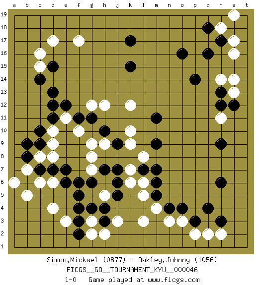Last move : 1-0 2007 November 20 5:50:34 [Event "FICGS__GO__TOURNAMENT_KYU__000046"] [Site "FICGS"] [Date "2007.10.05"] [Round "1"] [Black "Simon,Mickael"] [White "Oakley,Johnny"] [Result "1-0"] [Rating 1 "0877"] [Rating 2 "1056"] 1.q16 d4 2.q4 d17 3.d15 c15 4.c14 c16 5.d13 f17 6.c9 o3 7.r6 q2 8.r3 l3 9.r9 r14 10.o16 s16 11.r17 r11 12.k17 c6 13.f3 e3 14.f4 j3 15.j5 r2 16.o4 n3 17.p3 p2 18.n4 m4 19.m5 l5 20.m6 l6 21.p14 s17 22.r13 s13 23.s12 s14 24.r12 r18 25.q18 s19 26.e6 d8 27.j7 h6 28.h7 l8 29.l7 k7 30.m7 k6 31.j6 k9 32.h10 d9 33.c10 d10 34.d11 e11 35.d12 f10 36.j9 g9 37.m9 k10 38.m11 k12 39.k15 h12 40.g11 g12 41.g6 h5 42.h4 g5 43.f5 g7 44.f6 g3 45.h3 g2 46.g4 h5 47.f2 h2 48.d7 c8 49.c7 b7 50.b6 d6 51.e7 b5 52.b8 a6 53.b9 g8 54.e12 h9 55.f11 1-0 Here are the names of the openings (joseki) played in the four corners : Corner d16 : d17 d15 Komoku (Somok, Xiao~mu`) 3-4 Point. The komoku (3-4) point is the traditional corner enclosure move.. Ikken Takagakari (Hankan Nop'dakeolch'im, Yi Gaogua`jiao~, 1-Space High Approach). The 5-4 approach move has become more popular in modern times, as modern Go emphasizes speed and influence. Corner d4 : d4 c9 Hoshi (Hwajeom, Seongjeom, Xingwei`) 4-4 Point. The star or hoshi (4-4) point, emphasizing influence at the potential expense of territory. Corner q4 : q4 o3 Hoshi (Hwajeom, Seongjeom, Xingwei`) 4-4 Point. The star or hoshi (4-4) point, emphasizing influence at the potential expense of territory. Ikken Kakari (Hankan Keolch'im, Yi Gua`jiao~, 1-Space Low Approach). White 2 is the standard approach move to the 4-4. Corner q16 : q16 r14 Hoshi (Hwajeom, Seongjeom, Xingwei`) 4-4 Point. The star or hoshi (4-4) point, emphasizing influence at the potential expense of territory. Ikken Kakari (Hankan Keolch'im, Yi Gua`jiao~, 1-Space Low Approach). White 2 is the standard approach move to the 4-4. Player Black won this Go (weiqi, baduk) game. Follow this game move after move (download)Don't make a play adjacent to a cutting-point. (Anonymous) The question of whether computers can think is just like question of whether submarines can swim. (Edsger W. Dijkstra)