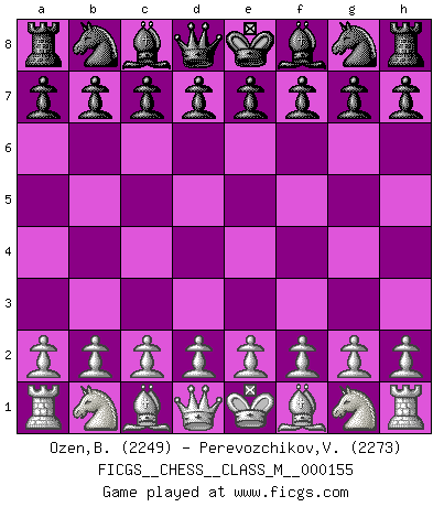 Last move : 1/2-1/2 2025 September 13 9:41:56 [Event "FICGS__CHESS__CLASS_M__000155"] [Site "FICGS"] [Date "2025.07.13"] [Round "1"] [White "Ozen,Bahadir"] [Black "Perevozchikov,Vjacheslav"] [Result "1/2-1/2"] [WhiteElo "2249"] [BlackElo "2273"] 1.d4 e6 2.Nf3 d5 3.c4 Nf6 4.Nc3 dxc4 5.e4 Bb4 6.Bxc4 Nxe4 7.O-O Nxc3 8.bxc3 Be7 9.Ne5 O-O 10.Qg4 Nc6 11.Re1 f5 12.Qf3 Nxe5 13.Rxe5 Kh8 14.Bf4 Bd6 15.Re2 Bxf4 16.Qxf4 Qd6 17.Re5 Bd7 18.Qe3 Rf6 19.Re1 Raf8 20.h4 1/2-1/2 Follow this game move after move (download)Best by test: 1. e4 (Bobby Fischer) Schach ist wie eine schöne Frau, zu der wir ständig zurückkehren, gleichviel, wie oft sie uns zurückweist. (Anonymous) Un juego de Ajedrez es un dialogo, una conversación entre un jugador y su oponente. Cada movimiento del oponente puede contener amenazas o tropiezos, pero un jugador no se puede defender de las amenazas o tomar ventaja de los tropiezos si es que no se pregunta a sí mismo: ¿Que es lo que mi oponente va a hacer después de cada movida?. (Bruce A. Moon) C'est la seule position que je connaisse où les deux camps sont mals. Propos prêtés à V. Anand. Success without honor is an unseasoned dish; it will satisfy your hunger, but it won't taste good. (Joe Paterno)