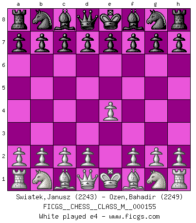 Last move : 1/2-1/2 2025 September 26 21:44:53 [Event "FICGS__CHESS__CLASS_M__000155"] [Site "FICGS"] [Date "2025.07.13"] [Round "1"] [White "Swiatek,Janusz"] [Black "Ozen,Bahadir"] [Result "1/2-1/2"] [WhiteElo "2243"] [BlackElo "2249"] 1.e4 e5 2.Nf3 Nf6 3.Nxe5 d6 4.Nf3 Nxe4 5.d4 d5 6.Bd3 Bd6 7.O-O O-O 8.c4 c6 9.Re1 Bf5 10.Qb3 Na6 11.cxd5 cxd5 12.Nc3 Be6 13.a3 Nc7 14.Qc2 f5 15.Ne5 Rc8 16.Bf4 g5 17.Bd2 Na6 18.Bxa6 bxa6 19.Qd1 Qb6 20.Nxe4 fxe4 21.Be3 Bxe5 22.dxe5 Qxb2 23.Rb1 Qxe5 24.Bd4 Qf5 25.h3 h6 26.Rb7 Rf7 27.Qb3 e3 28.f3 Qc2 29.Kh2 1/2-1/2 Follow this game move after move (download)My opponents make good moves too. Sometimes I don't take these things into consideration. (Bobby Fischer) Schach verlangt totale Konzentration. (Robert James Fischer) En un gambito tu regalas un Peón por el bién de tomar un juego perdido. (Samuel Standige Boden) La vérité est comme le meilleur coup aux échecs : elle existe, mais il faut la chercher. (Arturo Perez-Reverte) The weakness of an artist is dogma. (Josh Waitzkin)
