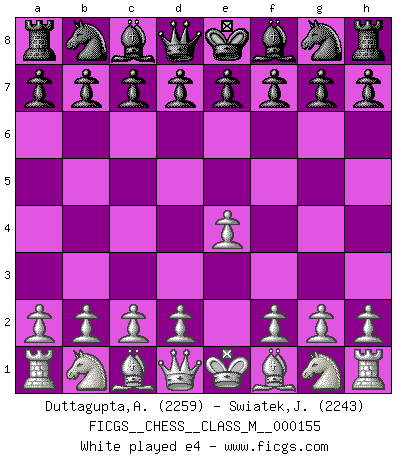 Last move : 1/2-1/2 2025 September 18 20:9:12 [Event "FICGS__CHESS__CLASS_M__000155"] [Site "FICGS"] [Date "2025.07.13"] [Round "1"] [White "Duttagupta,Aniruddha"] [Black "Swiatek,Janusz"] [Result "1/2-1/2"] [WhiteElo "2259"] [BlackElo "2243"] 1.e4 e5 2.Nf3 Nc6 3.Bb5 Nf6 4.O-O Nxe4 5.Re1 Nd6 6.Nxe5 Be7 7.Bf1 Nxe5 8.Rxe5 O-O 9.d4 Ne8 10.Re1 d5 11.Bf4 c6 12.c3 a5 13.Nd2 a4 14.Qf3 Bd6 15.Bd3 Bxf4 16.Qxf4 Qf6 17.Qxf6 Nxf6 18.Nf1 g6 19.Re5 Nh5 20.f3 Ng7 21.Ng3 Re8 22.Rxe8+ Nxe8 1/2-1/2 Follow this game move after move (download)A passed Pawn increases in strength as the number of pieces on the board diminishes. (Capablanca) Kasparov ist eine Art Monster mit hundert Augen, denen auch nicht das Geringste entgeht. (Tony Miles) Una buena ofensiva y una buena defensa, comienzan ambas con un buen desarrollo. (Bruce A. Moon) La menace est plus forte que l'exécution. (Aaron Nimzovitch) The real danger is not that computers will begin to think like men, but that men will begin to think like computers. (Sydney J. Harris)