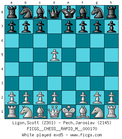 Last move : 1-0 2025 September 4 5:25:32 [Event "FICGS__CHESS__RAPID_M__000170"] [Site "FICGS"] [Date "2025.07.16"] [Round "1"] [White "Ligon,Scott"] [Black "Pech,Jaroslav"] [Result "1-0"] [WhiteElo "2301"] [BlackElo "2145"] 1.e4 d5 2.exd5 Qxd5 3.Nc3 Qa5 4.d4 Nf6 5.Nf3 c6 6.Bc4 Bf5 7.Ne5 e6 8.g4 Bg6 9.h4 Nbd7 10.Nxd7 Nxd7 11.h5 Be4 12.O-O Bd5 13.Nxd5 cxd5 14.Bd3 Bd6 15.a4 g6 16.Bd2 Qd8 17.Kg2 Qf6 18.g5 1-0 Follow this game move after move (download)I won't play with you anymore. You have insulted my friend. - When an opponent cursed himself for a blunder. (Miguel Najdorf) Karpov ist ein Museumsstück. (Garry Kasparov) El tablero es el mundo, las piezas es el fenomeno del universo, las reglas del juego son lo que llamamos leyes de la naturaleza y el jugador del lado opuesto, se encuentra oculto a nuestra vista. (Thomas Huxley) Echiquier : carré parfait, comme la Jérusalem nouvelle décrite par l'auteur de l'Apocalypse, huit cases sur huit, exaltation du chiffre 4, symbole du cosmos aux quatre horizons... où le noir et le blanc, l'ombre et la lumière, le mal et le bien s'entremêlent et se conjuguent. (Robert Couffignal, Le Gambit du poète) Panic is a sudden desertion of us, an a going over to the enemy of our imagination. (Christian Nevell Bovee)
