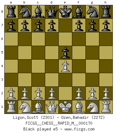 Last move : 1/2-1/2 2025 August 4 21:49:32 [Event "FICGS__CHESS__RAPID_M__000170"] [Site "FICGS"] [Date "2025.07.16"] [Round "1"] [White "Ligon,Scott"] [Black "Ozen,Bahadir"] [Result "1/2-1/2"] [WhiteElo "2301"] [BlackElo "2272"] 1.e4 e5 2.Nf3 Nc6 3.Bb5 Nf6 4.O-O Nxe4 5.Re1 Nd6 6.Nxe5 Be7 7.Bf1 Nxe5 8.Rxe5 O-O 9.Nc3 Bf6 10.Re1 Re8 11.Nd5 Rxe1 12.Qxe1 b6 13.Nxf6+ Qxf6 14.d3 Bb7 15.Qd2 c5 16.c3 h6 17.a4 Nf5 18.Qf4 a5 19.Bd2 Re8 20.h4 Bc6 1/2-1/2 Follow this game move after move (download)I am still a victim of Chess. It has all the beauty of art and much more. It cannot be commercialized. Chess is much purer than art in its social position. (Marcel Duchamp) Offensichtlich kennt Kasparow nichts anderes als Schach, und ich könnte 500 weitere Spieler dieser Sorte benennen. (Judith Polgar) Los tropiezos estan todos ahí en el tablero, esperando que se cometan. (Savielly Tartakover) Les ravages du H expliquent la différence de niveau entre Tal et Thal [Abergel]. Everybody lies. (Gregory House, House M.D.)