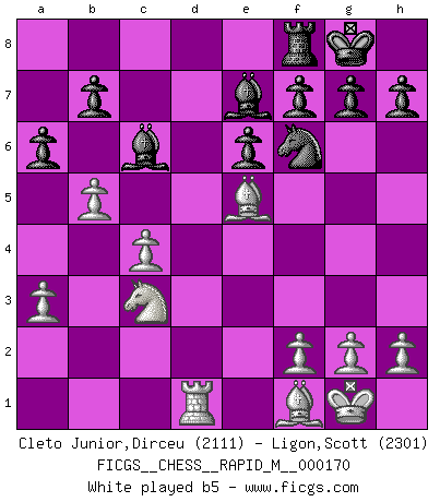 Last move : 1/2-1/2 2025 July 23 15:8:13 [Event "FICGS__CHESS__RAPID_M__000170"] [Site "FICGS"] [Date "2025.07.16"] [Round "1"] [White "Cleto Junior,Dirceu"] [Black "Ligon,Scott"] [Result "1/2-1/2"] [WhiteElo "2111"] [BlackElo "2301"] 1.e4 c5 2.Nf3 Nc6 3.Bb5 e6 4.O-O Nge7 5.Re1 a6 6.Bf1 d5 7.exd5 Nxd5 8.d4 Nf6 9.Be3 cxd4 10.Nxd4 Bd7 11.c4 Nxd4 12.Bxd4 Bc6 13.Nc3 Be7 14.a3 Qd6 15.b4 Rd8 16.Be5 Qxd1 17.Rexd1 Rxd1 18.Rxd1 O-O 19.b5 axb5 20.cxb5 Bd5 21.Bxf6 Bxf6 22.Nxd5 exd5 23.Rxd5 Rd8 24.Rc5 g6 25.g3 Rd2 26.Rc7 1/2-1/2 Follow this game move after move (download)A Chess game is divided into three stages: the first, when you hope you have the advantage, the second when you believe you have an advantage, and the third... when you know you're going to lose ! (Savielly Tartakower) Mit Schach schule ich mein Gefühl für Geometrie, was für Tennis und Schach gleichermaßen wichtig ist. (Boris Becker) Los libros de Ajedrez deben de usarse igual como usamos los anteojos: para mejorar la vista, aunque algunos jugadores los quieren usar como si ellos les otorgaran la vision. (José Raúl Capablanca) L'attaque fait le spectacle, la défense gagne les matchs. (Dicton footballistique) The faster the computer, the slower the brain. (Thibault de Vassal)