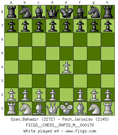 Last move : 1/2-1/2 2025 November 3 12:25:28 [Event "FICGS__CHESS__RAPID_M__000170"] [Site "FICGS"] [Date "2025.07.16"] [Round "1"] [White "Ozen,Bahadir"] [Black "Pech,Jaroslav"] [Result "1/2-1/2"] [WhiteElo "2272"] [BlackElo "2145"] 1.e4 c6 2.Nf3 d5 3.d3 dxe4 4.dxe4 Qxd1+ 5.Kxd1 Bg4 6.Be2 Nd7 7.Ne1 Bxe2+ 8.Kxe2 e6 9.Nd2 f5 10.Nef3 Ngf6 11.Ng5 fxe4 12.Ndxe4 Nxe4 13.Nxe4 Nf6 14.Ng5 e5 15.Rd1 Be7 16.g3 O-O 17.Be3 b6 18.a4 Rab8 19.c3 Nd5 20.Ne4 Rfd8 21.h4 Nxe3 22.fxe3 Kf7 23.Rf1+ Ke6 24.h5 Rd7 25.b3 Rbd8 26.g4 a5 27.Ra2 h6 28.Rd2 Rxd2+ 29.Nxd2 Rg8 30.Ne4 Rd8 31.Ng3 Rd7 32.Ra1 Bh4 33.Nf5 Bg5 34.Rc1 Bf6 35.Ng3 Bh4 36.Ne4 Be7 37.Rh1 1/2-1/2 Follow this game move after move (download)Different people feel differently about resigning. (Bobby Fischer) Capablanka war das größte Genie der Schachgeschichte! Aber denken sie nicht er habe nichts vom Schach verstanden. Er wusste nur soviel wie er wissen musste um seine Ziele zu erreichen. (Mikhail Moiseyevich Botvinik) Solo el jugador con la iniciativa tiene el derecho a atacar. (Wilhelm Steinitz) La solitude du joueur d'Echecs à l'approche du mat est semblable à celle du condamné. (Francis Szpiner) Creativity is allowing yourself to make mistakes. Art is knowing which ones to keep. (Scott Adams)