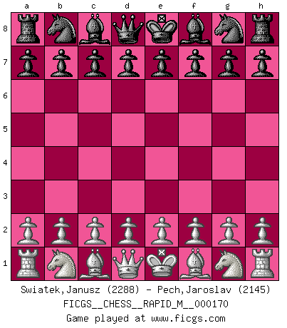 Last move : 1-0 2025 October 10 2:35:22 [Event "FICGS__CHESS__RAPID_M__000170"] [Site "FICGS"] [Date "2025.07.16"] [Round "1"] [White "Swiatek,Janusz"] [Black "Pech,Jaroslav"] [Result "1-0"] [WhiteElo "2288"] [BlackElo "2145"] 1.e4 e6 2.d4 d5 3.Nc3 Nf6 4.e5 Nfd7 5.f4 c5 6.Nf3 Nc6 7.Be3 a6 8.Ne2 Qb6 9.Qc1 Be7 10.c3 O-O 11.h4 f6 12.h5 h6 13.Rh3 Qa5 14.Bd2 Qd8 15.Qc2 cxd4 16.cxd4 Rf7 17.Rd1 Nb6 18.Nc3 Nc4 19.Bxc4 dxc4 20.Qg6 Qf8 21.a3 Bd7 22.Rg3 Kh8 23.Qe4 Bd8 24.Nh4 1-0 This chess game has been lost on time (started : 2025.07.16 20:54:3) Follow this game move after move (download)Chess, like love, is infectious at any age. (Flohr) Vielleicht wirkt die Aura früherer Spieler glanzvoller als die der heutigen Spieler, aber das liegt daran, dass man kein Programm wie Fritz hatte, das einem all die Löcher in ihren Partien zeigt. (Vladimir Kramnik) Jugadores de primera clase pierden en contra de jugadores de segunda clase porque los jugadores de segunda clase a veces juegan una partida de primer clase. (Siegbert Tarrasch) 'L'échange des dames est un coup dur pour les deux adversaires...' Un journaliste lors d'une partie du match Spassky-Fischer The obstacle is the path. (Zen proverb)