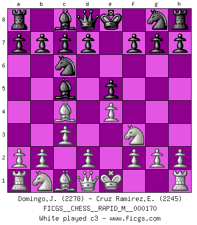 Last move : 1-0 2025 October 1 7:17:56 [Event "FICGS__CHESS__RAPID_M__000170"] [Site "FICGS"] [Date "2025.07.16"] [Round "1"] [White "Domingo,Jordi"] [Black "Cruz Ramirez,Eliecer"] [Result "1-0"] [WhiteElo "2278"] [BlackElo "2245"] 1.e4 e5 2.Nf3 Nc6 3.Bc4 Bc5 4.c3 Nf6 5.d3 O-O 6.Bg5 h6 7.Bh4 a5 8.Nbd2 d6 9.a4 Be6 10.O-O Qe7 11.Bd5 g5 12.Nxg5 hxg5 13.Bxg5 Kg7 14.Bxc6 bxc6 15.d4 exd4 16.e5 dxe5 17.cxd4 Qd7 18.dxc5 Nd5 19.Re1 Rh8 20.Ne4 f6 21.Bd2 Bf5 22.Ra3 Rh4 23.Ng3 Be6 24.h3 Rg8 25.Ne4 Kf7 26.Rg3 Rgh8 27.Qf3 Bf5 28.Bxa5 Ra8 29.Bd2 Rxa4 30.b4 Ra8 31.Nxf6 Nxf6 32.Rxe5 Be4 33.Rxe4 1-0 Follow this game move after move (download)Why must I lose to this idiot ? (Aron Nimzovich) Wenn Capablanka heute auf der Schachbühne erscheinen würde, hätte er ein halbes Jahr gebraucht um sich die Schachtheorie anzueignen. Und dann hätte er alles und jeden besiegt. (Mikhail Moiseyevich Botvinik) Todos los jugadores de Ajedrez deberían tener un pasatiempo. (Savielly Tartakower) Mais l'homme est une créature légère et illogique : semblable au joueur d'échecs, il n'aime que le processus du but à atteindre, non le but lui-même. (Dostoïevsky) Never was anything great achieved without danger. (Niccolo Machiavelli)
