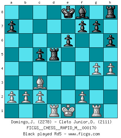 Last move : 1-0 2025 August 1 20:22:34 [Event "FICGS__CHESS__RAPID_M__000170"] [Site "FICGS"] [Date "2025.07.16"] [Round "1"] [White "Domingo,Jordi"] [Black "Cleto Junior,Dirceu"] [Result "1-0"] [WhiteElo "2278"] [BlackElo "2111"] 1.e4 c5 2.Nf3 e6 3.d4 cxd4 4.Nxd4 Nf6 5.Nc3 d6 6.g4 h6 7.h4 Nc6 8.Rg1 d5 9.exd5 Nxd5 10.Nxd5 Qxd5 11.Bg2 Qe5+ 12.Be3 Bd7 13.Nxc6 Bxc6 14.Bxc6+ bxc6 15.Qd4 Qxd4 16.Bxd4 c5 17.Bc3 Rd8 18.Rd1 Rd5 19.Rg3 f6 20.h5 Bd6 21.Rgd3 Rxd3 22.Rxd3 Kd7 23.Bd2 Rb8 24.Bc1 c4 25.Rd4 Rc8 26.Bd2 e5 27.Rd5 Kc6 28.Ra5 Bc5 29.Ra4 Kd5 30.Ra5 Ke6 31.Ke2 Bb6 32.Rb5 c3 33.Bxc3 Rc4 34.f3 e4 35.f4 1-0 Follow this game move after move (download)All Chess players should have a hobby. (Savielly Tartakower) Wie bekannt hörte Morphy 1859 auf, Schach zu spielen. Seine Enttäuschung galt nicht so sehr dem Schach, wie den Schachspielern. (Robert James Fischer) El arma más poderosa en el Ajedrez, es tener la próxima movida. (David Bronstein) Plusieurs personnes se sont demandées comment Tal faisait pour gagner... En fait, c'est très simple ! Il met ses pièces au centre de l'échiquier et les sacrifie quelque part ! (David Bronstein) To err is human, to shift the blame on someone else is tactical. (Mladen Jankovic)