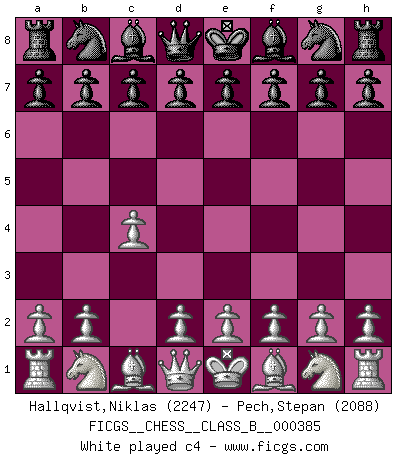 Last move : 1-0 2025 September 2 3:23:56 [Event "FICGS__CHESS__CLASS_B__000385"] [Site "FICGS"] [Date "2025.07.19"] [Round "1"] [White "Hallqvist,Niklas"] [Black "Pech,Stepan"] [Result "1-0"] [WhiteElo "2247"] [BlackElo "2088"] 1.c4 e5 2.g3 Nf6 3.Bg2 d5 4.cxd5 Nxd5 5.Nf3 Nc6 6.O-O Nb6 7.Nc3 Be7 8.b3 O-O 9.Bb2 Re8 10.Rc1 1-0 Follow this game move after move (download)That's what Chess is all about. One day you give your opponent a lesson, the next day he gives you one. (Bobby Fischer) Schach ist ein schwarz-weisser Dschungel. (Garry Kasparov) El ganador de una partida es aquel jugador que hace el penúltimo error. (Savielly Tartakover) Nous vivons dans un monde échiquéen : chaque jour qui passe est un défi à relever. (Philosophe Sasha) Art is not a thing, it is a way. (Elbert Hubbard)