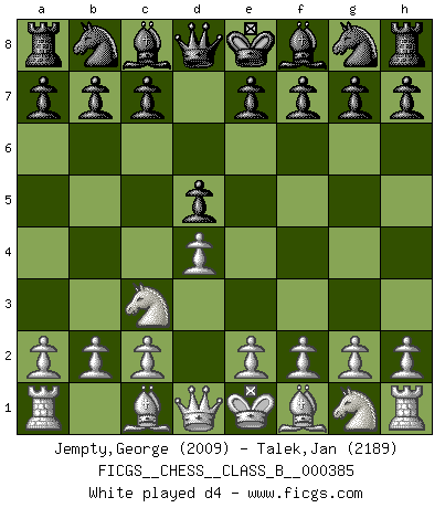 Last move : 1/2-1/2 2025 October 5 23:51:18 [Event "FICGS__CHESS__CLASS_B__000385"] [Site "FICGS"] [Date "2025.07.19"] [Round "1"] [White "Jempty,George"] [Black "Talek,Jan"] [Result "1/2-1/2"] [WhiteElo "2009"] [BlackElo "2189"] 1.Nc3 d5 2.d4 Nf6 3.Bf4 c5 4.e4 Nxe4 5.Nxe4 dxe4 6.dxc5 Qa5+ 7.c3 Qxc5 8.Qa4+ Nc6 9.Qxe4 g6 10.Nf3 Bg7 11.Qe3 Qxe3+ 12.Bxe3 O-O 13.a4 Rd8 14.Be2 Na5 15.O-O Be6 16.Rfd1 Bc4 17.Rxd8+ Rxd8 18.Kf1 b6 19.Nd2 Be6 20.Ke1 Bd5 21.g3 Rc8 22.Rc1 Nb7 23.Ba6 Rc7 24.f4 h5 25.Kf2 Kf8 26.Be2 Be6 27.Bd1 Nd6 28.Bc2 Nf5 29.Bxf5 Bxf5 30.Nf3 Bg4 31.Ne5 Bxe5 32.fxe5 Rc4 33.b3 Re4 34.Re1 Ke8 35.Bd4 1/2-1/2 Follow this game move after move (download)I still hope to kill Fischer. (Boris Spassky) Der Umstand, daß uns eine 7 Stunden Zeitkontrolle ermöglicht eine großartige, tiefe Partie zu spielen, ist für die Massenmedien nicht weiter von Bedeutung. (Alexej Shirov) Los errores estan ahí, esperando a que se cometan. (Savielly Tartakower) Ce qui est bien, c'est d'avoir tout un tas de pièces en prise : l'adversaire ne peut en prendre qu'une à la fois. Cité par Thierry Audin. In God we trust, all others we virus scan. (Anonymous)