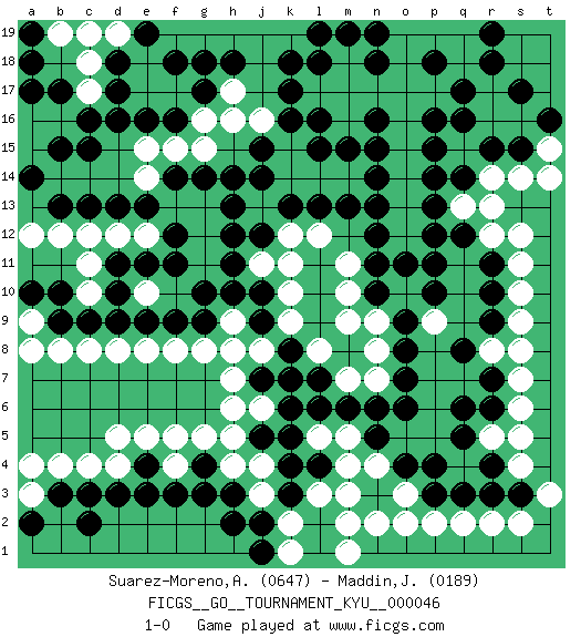 Last move : 1-0 2008 April 17 21:31:7 [Event "FICGS__GO__TOURNAMENT_KYU__000046"] [Site "FICGS"] [Date "2007.10.05"] [Round "1"] [Black "Suarez-Moreno,Alejandro"] [White "Maddin,John"] [Result "1-0"] [Rating 1 "0647"] [Rating 2 "0189"] 1.q16 q4 2.d16 d4 3.f3 q18 4.p18 p17 5.q17 o18 6.p16 o17 7.r18 p19 8.q12 r14 9.q14 r12 10.r11 s12 11.r15 s14 12.s15 s11 13.r10 s10 14.r6 s4 15.r9 s9 16.k4 l3 17.k3 k2 18.j2 k1 19.j1 m2 20.l4 m4 21.l6 m5 22.m6 l5 23.k5 h4 24.h3 f4 25.g4 g5 26.g3 j4 27.j5 h5 28.e4 f5 29.d3 d5 30.c3 b4 31.b3 c4 32.o4 o3 33.n3 m3 34.p3 o2 35.p4 p2 36.q3 q2 37.r3 r2 38.s3 s2 39.q5 s6 40.r7 s7 41.k16 k10 42.j7 h7 43.j9 h9 44.j10 m9 45.o9 n7 46.n6 m7 47.l7 l8 48.k8 k9 49.o7 n9 50.n10 m10 51.n11 m11 52.n12 q13 53.p13 r13 54.p11 r8 55.q8 s8 56.r4 s5 57.d10 d8 58.f9 f8 59.g9 g8 60.h10 h8 61.n15 m14 62.k13 k12 63.j12 k11 64.l13 l12 65.m13 n8 66.o8 n4 67.c9 b8 68.b9 c11 69.c13 d12 70.d13 e12 71.f11 e10 72.e9 e8 73.d9 j8 74.k7 j6 75.k6 h6 76.m17 m18 77.l18 n17 78.m19 m16 79.n18 l17 80.k18 m18 81.n19 m17 82.k17 k15 83.j15 k14 84.j14 l14 85.r19 q19 86.m15 o15 87.n14 o14 88.p14 o13 89.n13 o12 90.p12 t15 91.t16 t14 92.s17 c17 93.c16 b16 94.b15 a16 95.d17 c18 96.d18 b19 97.a18 e15 98.e13 f13 99.f14 g13 100.g14 e14 101.e16 f15 102.f16 g16 103.g17 g15 104.h14 h17 105.g18 d19 106.e19 c19 107.f18 c10 108.d11 c12 109.b13 a15 110.a14 b12 111.h12 g11 112.f12 g12 113.g10 c8 114.e11 a12 115.c15 j16 116.h18 j11 117.h11 o16 118.o11 a9 119.a10 a8 120.b10 a3 121.a2 a4 122.c2 e5 123.e3 p9 124.p10 r5 125.q6 j3 126.o6 t3 127.h2 m1 128.n5 n2 129.b17 pass 130.a17 o19 131.l19 h16 132.l15 pass 133.h13 pass 134.a19 pass 135.pass pass 136.p15 pass 137.l16 pass 138.n16 pass 139.p18 pass 140.pass pass 141.pass pass 142.pass 1-0 Here are the names of the openings (joseki) played in the four corners : Corner d4 : d4 f3 Hoshi (Hwajeom, Seongjeom, Xingwei`) 4-4 Point. The star or hoshi (4-4) point, emphasizing influence at the potential expense of territory. Ikken Kakari (Hankan Keolch'im, Yi Gua`jiao~, 1-Space Low Approach). Black 2 is the standard approach move to the 4-4. Corner q16 : q16 q18 Hoshi (Hwajeom, Seongjeom, Xingwei`) 4-4 Point. The star or hoshi (4-4) point, emphasizing influence at the potential expense of territory. Corner q4 : q4 r6 Hoshi (Hwajeom, Seongjeom, Xingwei`) 4-4 Point. The star or hoshi (4-4) point, emphasizing influence at the potential expense of territory. Ikken Kakari (Hankan Keolch'im, Yi Gua`jiao~, 1-Space Low Approach). Black 2 is the standard approach move to the 4-4. Player Black won this Go (weiqi, baduk) game. Follow this game move after move (download)Keep away from thickness. (Anonymous) Luck never gives; it only lends. (Swedish proverb)