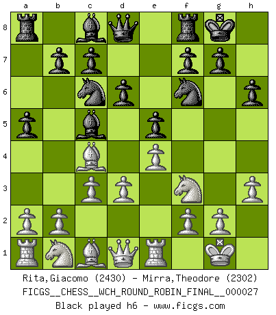 Last move : 1/2-1/2 2025 August 9 15:31:16 [Event "FICGS__CHESS__WCH_ROUND_ROBIN_FINAL__000027"] [Site "FICGS"] [Date "2025.07.21"] [Round "1"] [White "Rita,Giacomo"] [Black "Mirra,Theodore"] [Result "1/2-1/2"] [WhiteElo "2430"] [BlackElo "2302"] 1.e4 e5 2.Nf3 Nc6 3.Bc4 Bc5 4.c3 Nf6 5.d3 d6 6.O-O a5 7.Re1 O-O 8.h3 h6 9.Nbd2 Be6 10.Bb5 Qb8 11.Nf1 Qa7 12.Re2 a4 13.Ng3 Qa5 14.Bxc6 bxc6 15.Bd2 Qa6 16.d4 Bb6 17.dxe5 dxe5 18.Nxe5 Qb5 19.Nf3 Bc4 20.Re1 Qxb2 21.e5 Nd5 22.Rc1 a3 23.Nd4 Bxd4 24.cxd4 Qxa2 25.Bxh6 gxh6 26.Rc2 Qb3 27.Nf5 Nf4 28.Qg4+ Ng6 29.Rxc4 Qxc4 30.Qh5 Qc2 31.Nxh6+ Kg7 32.Nf5+ Kg8 33.Nh6+ Kg7 1/2-1/2 Follow this game move after move (download)You sit at the board and suddenly your heart leaps. Your hand trembles to pick up the piece and move it. But what Chess teaches you is that you must sit there calmly and think about whether it's really a good idea and whether there are other better ideas. (Stanley Kubrick) Schach ist ein schwarz-weisser Dschungel. (Garry Kasparov) Desconfianza es la característica mas necesaria de un jugador de Ajedrez. (Siegbert Tarrasch) Ce n'est pas pour s'amuser qu'il joue aux échecs : il célèbre un culte. (Vladimir Nabokov) The greatest con, that he ever pulled... was making you believe... that he is you. (Revolver, movie)
