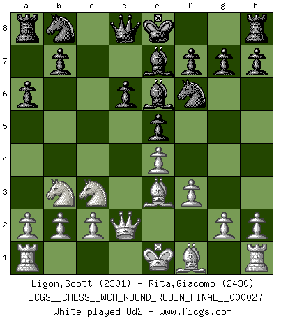 Last move : 1/2-1/2 2025 August 13 0:2:21 [Event "FICGS__CHESS__WCH_ROUND_ROBIN_FINAL__000027"] [Site "FICGS"] [Date "2025.07.21"] [Round "1"] [White "Ligon,Scott"] [Black "Rita,Giacomo"] [Result "1/2-1/2"] [WhiteElo "2301"] [BlackElo "2430"] 1.e4 c5 2.Nf3 d6 3.d4 cxd4 4.Nxd4 Nf6 5.Nc3 a6 6.Be3 e5 7.Nb3 Be6 8.f3 Be7 9.Qd2 O-O 10.O-O-O Nbd7 11.g4 b5 12.g5 Nh5 13.Kb1 Nb6 14.Na5 Rc8 15.Rg1 g6 16.h4 Qc7 17.Nd5 Nxd5 18.exd5 Bd7 19.c4 Bd8 20.Nc6 Bxc6 21.dxc6 Qxc6 22.cxb5 axb5 23.Rc1 Qxc1+ 24.Qxc1 Rxc1+ 25.Bxc1 b4 26.Rg4 Nf4 27.Bxf4 exf4 28.Rxf4 b3 29.a4 Re8 30.Re4 Rxe4 31.fxe4 f6 32.Bc4+ Kg7 33.Bxb3 fxg5 34.hxg5 Bxg5 35.Kc2 Kf6 36.Kd3 Ke5 37.a5 Bh4 38.Bg8 h5 39.Bh7 Bd8 40.a6 Bb6 41.Bxg6 h4 42.Bh5 d5 43.exd5 1/2-1/2 Follow this game move after move (download)It is always better to sacrifice your opponent's men. (Savielly Tartakower) Meine Liebe ist Schach, Schach, Schach. Ich muss jeden Tag Schach spielen, deshalb fühle ich mich so stark. (Miguel Najdorf) El Ajedrez es el juego mas altamente simbólico, pero las agresiones estan por lo tanto aún mas francamente representadas en la partida. Tal vez comenzo como un juego de guerra; Algo como la representación de una batalla en miniatura entre las fuerzas de dos reinos. (Karl Meninger) Vous savez, camarade Pachman, je n'éprouve pas de plaisir à être ministre, je jouerais plutôt aux échecs comme vous, ou alors ferais une révolution au Venezuela. (Che Guevara à Ludek Pachman, 'Checkmate in Prague', 1975) I'm extremely disappointed. I send you out for exciting, new designer drugs, you come back with tomato sauce. (Gregory House, House M.D.)