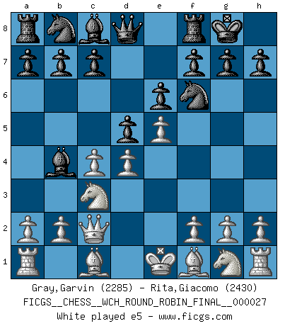 Last move : 1/2-1/2 2025 September 25 4:2:37 [Event "FICGS__CHESS__WCH_ROUND_ROBIN_FINAL__000027"] [Site "FICGS"] [Date "2025.07.21"] [Round "1"] [White "Gray,Garvin"] [Black "Rita,Giacomo"] [Result "1/2-1/2"] [WhiteElo "2285"] [BlackElo "2430"] 1.d4 Nf6 2.c4 e6 3.Nc3 Bb4 4.Qc2 O-O 5.e4 d5 6.e5 Ne4 7.Bd3 c5 8.Nf3 cxd4 9.Nxd4 Nd7 10.Bf4 Qh4 11.g3 Qh5 12.O-O g5 13.cxd5 gxf4 14.dxe6 fxe6 15.Nxe4 Nxe5 16.gxf4 Rxf4 17.Kh1 Kh8 18.Rg1 Nxd3 19.Qxd3 Be7 20.Rac1 Bd7 21.Qg3 Rf7 22.Rc7 Bh4 23.Qc3 e5 24.Nd6 Rf6 25.Rxd7 Bxf2 26.N4f5 Bxg1 27.Nf7+ Rxf7 28.Qxe5+ Kg8 29.Qg3+ Kh8 30.Qe5+ Kg8 31.Qg3+ Kh8 32.Qe5+ 1/2-1/2 Follow this game move after move (download)Chess makes man wiser and clear-sighted. (Vladimir Putin) Auf jeden Fall musst du zuerst Rechtsanwalt werden, damit du deine eigenen Interessen und die deiner Familie vertreten kannst. [Brief an seinen Sohn] (José Raúl Capablanca) Si el ingenio solamente fuese necesario para lucirse, las mujeres serían las mejores jugadoras de Ajedrez del mundo. (Albin) Karpov est une pièce de musée. (Garry Kasparov) The only thing that overcomes hard luck is hard work. (Harry Golden)