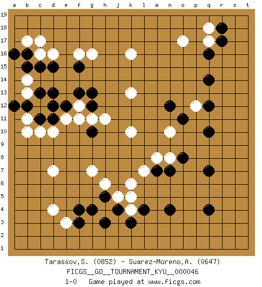 Last move : 1-0 2007 November 18 19:9:59 [Event "FICGS__GO__TOURNAMENT_KYU__000046"] [Site "FICGS"] [Date "2007.10.05"] [Round "1"] [Black "Tarassov,Sergey"] [White "Suarez-Moreno,Alejandro"] [Result "1-0"] [Rating 1 "0852"] [Rating 2 "0647"] 1.q16 d4 2.q4 d16 3.q10 d10 4.f3 e3 5.f4 k16 6.k3 o17 7.q14 d7 8.q7 k10 9.g13 k13 10.g10 g16 11.d13 g7 12.c11 c10 13.c15 c16 14.b16 b17 15.a16 c17 16.d15 b14 17.b15 b11 18.b12 b10 19.d11 c12 20.c13 b13 21.a12 e11 22.d12 g11 23.g12 h11 24.f15 f16 25.e12 f12 26.f13 f11 27.n4 q17 28.r17 q18 29.r18 h4 30.h3 k6 31.h5 k4 32.j4 j5 33.g4 h6 34.l4 p12 35.q12 k5 36.m7 l7 37.n12 m8 38.n7 n8 39.o8 n10 40.o11 1-0 Here are the names of the openings (joseki) played in the four corners : Corner d4 : d4 f3 Hoshi (Hwajeom, Seongjeom, Xingwei`) 4-4 Point. The star or hoshi (4-4) point, emphasizing influence at the potential expense of territory. Ikken Kakari (Hankan Keolch'im, Yi Gua`jiao~, 1-Space Low Approach). Black 2 is the standard approach move to the 4-4. Corner q16 : q16 o17 Hoshi (Hwajeom, Seongjeom, Xingwei`) 4-4 Point. The star or hoshi (4-4) point, emphasizing influence at the potential expense of territory. Ikken Kakari (Hankan Keolch'im, Yi Gua`jiao~, 1-Space Low Approach). White 2 is the standard approach move to the 4-4. Corner d16 : d16 g13 Hoshi (Hwajeom, Seongjeom, Xingwei`) 4-4 Point. The star or hoshi (4-4) point, emphasizing influence at the potential expense of territory. Player Black won this Go (weiqi, baduk) game. Follow this game move after move (download)Everything happens on a grid-engraved board with black and white pieces, but if that's all you see then you don't know Go. (Pierre Audouard) Fear is the path to the dark side. Fear leads to anger; anger leads to hate; hate leads to suffering. I sense much fear in you. (Master Yoda in Star Wars ep.1)