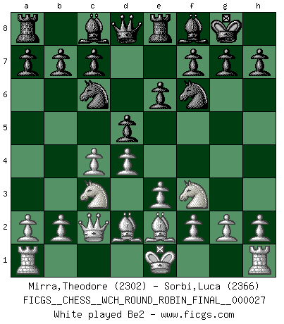 Last move : 1/2-1/2 2025 September 12 9:12:0 [Event "FICGS__CHESS__WCH_ROUND_ROBIN_FINAL__000027"] [Site "FICGS"] [Date "2025.07.21"] [Round "1"] [White "Mirra,Theodore"] [Black "Sorbi,Luca"] [Result "1/2-1/2"] [WhiteElo "2302"] [BlackElo "2366"] 1.d4 Nf6 2.c4 e6 3.Nf3 d5 4.Nc3 Bb4 5.Qa4+ Nc6 6.e3 O-O 7.Qc2 Re8 8.Bd2 Bf8 9.Be2 b6 10.a3 Ne7 11.O-O Ba6 12.cxd5 Bxe2 13.Nxe2 exd5 14.Rfc1 c6 15.Be1 Rc8 16.Qa4 Qc7 17.Rc2 c5 18.dxc5 bxc5 19.b4 c4 20.Ng3 Red8 21.Bc3 Ne8 22.Nd4 Qb7 23.Rd2 Nc6 24.Qd1 Nxd4 25.Bxd4 Nc7 26.Ne2 Nb5 27.Nc3 a6 28.h4 h6 29.g3 Rb8 30.Qf3 Rd7 31.Nxb5 axb5 32.Rda2 Ra8 33.a4 bxa4 34.Rxa4 Rxa4 35.Rxa4 Bxb4 36.Qf5 Bf8 37.Ra7 Qxa7 38.Bxa7 Rxa7 39.Qxd5 Rc7 40.Qa5 Rc5 41.Qc3 g6 42.h5 gxh5 43.Kh2 Bg7 44.Qb4 Rc8 45.Qb7 Rc5 46.Qb4 1/2-1/2 Follow this game move after move (download)A player surprised is half beaten. (Proverb) Jeder Schachmeister war einmal ein Anfänger. (Irving Chernev) Cuando la partida de Ajedrez termina, el Peón y el Rey regresan a la misma caja. (Irish saying) Aucun coup ne doit être joué sans but. (Pedro Damiano) Some people are so afraid to die that they never begin to live. (Henry Van Dyke)