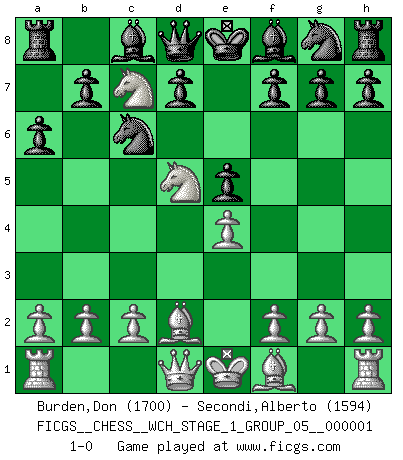 Last move : 1-0 2006 July 20 12:31:48 [Event "FICGS__CHESS__WCH_STAGE_1_GROUP_05__000001"] [Site "FICGS"] [Date "2006.07.01"] [Round "1"] [White "Burden,Don"] [Black "Secondi,Alberto"] [Result "1-0"] [WhiteElo "1700"] [BlackElo "1594"] 1.e4 c5 2.Nf3 Nc6 3.d4 cxd4 4.Nxd4 e5 5.Nb5 Qa5+ 6.Bd2 Qb6 7.N1c3 a6 8.Nd5 Qd8 9.Nbc7+ 1-0 Sicilian : Labourdonnais-Loewenthal variation Player White won this chess game. Follow this game move after move (download)With or without the title, Bobby Fischer was unquestionably the greatest player of his time. (Burt Hochberg) Als ich elf wurde, wurde ich einfach gut. (Robert James Fischer) Fischer no está bajo la obligación de nadie. (Joseph Platz) La tactique, c'est ce que vous faites quand il y a quelque chose à faire; la stratégie, c'est ce que vous faites quand il n'y a rien à faire. (Savielli Tartacower) Life is verb, not a noun. (Charlotte Perkins Gilman)