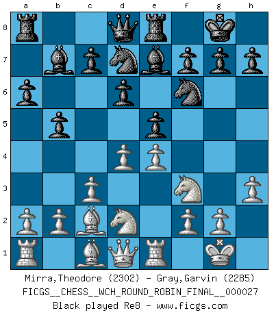 Last move : 1/2-1/2 2025 December 13 15:47:55 [Event "FICGS__CHESS__WCH_ROUND_ROBIN_FINAL__000027"] [Site "FICGS"] [Date "2025.07.21"] [Round "1"] [White "Mirra,Theodore"] [Black "Gray,Garvin"] [Result "1/2-1/2"] [WhiteElo "2302"] [BlackElo "2285"] 1.e4 e5 2.Nf3 Nc6 3.Bb5 a6 4.Ba4 Nf6 5.O-O Be7 6.Re1 b5 7.Bb3 O-O 8.c3 d6 9.h3 Nb8 10.d4 Nbd7 11.Nbd2 Bb7 12.Bc2 Re8 13.Nf1 Bf8 14.Ng3 a5 15.Bd2 a4 16.Bd3 c6 17.Rc1 h6 18.Qc2 Qb8 19.b3 axb3 20.axb3 Ra3 21.Be3 Qa8 22.Qd1 Qd8 23.Rb1 Qa8 24.Rc1 Qd8 25.Rb1 Qa8 26.Bc2 Qd8 27.Qc1 Ra8 28.Qd2 Ra2 29.Ra1 Rxa1 30.Rxa1 Qc7 31.Rd1 Bc8 32.Rc1 Bb7 33.Qe2 Bc8 34.Qd2 Qa5 35.Rf1 Qd8 36.Bd3 Qc7 37.Rd1 Nb6 38.Rb1 Nbd7 39.Re1 Nb6 40.Rb1 Nbd7 41.Re1 Nb6 42.Qc2 Nbd7 43.Qc1 Bb7 44.Qc2 Bc8 45.Ra1 Nb6 46.Qa2 Bb7 47.Qe2 Bc8 48.Qa2 Bb7 49.Qd2 Bc8 50.Qb2 Nbd7 51.Re1 Bb7 52.Bd2 Ra8 53.Qc2 Re8 54.Qc1 Qa5 55.Qb1 Qb6 56.Be3 Qc7 57.Qc1 Qa5 58.Re2 b4 59.cxb4 Qxb4 60.dxe5 Nxe5 61.Nxe5 Rxe5 62.Qb2 c5 63.Bd2 Qd4 64.Qc2 Ba6 65.Bxa6 Qa1+ 66.Re1 Qxa6 67.Bc3 Re6 68.Bxf6 Rxf6 69.Nh5 Re6 70.Nf4 Re8 71.Nd5 Ra8 72.h4 Qa2 73.Qxa2 Rxa2 74.Rb1 h5 75.b4 cxb4 76.Rxb4 g6 77.Rb8 Ra7 78.g3 Kg7 79.Kg2 Be7 80.Rb6 Kf8 81.Rb8+ Kg7 82.Rb6 1/2-1/2 Follow this game move after move (download)Why must I lose to this idiot ? (Aron Nimzovich) Wenn Capablanka heute auf der Schachbühne erscheinen würde, hätte er ein halbes Jahr gebraucht um sich die Schachtheorie anzueignen. Und dann hätte er alles und jeden besiegt. (Mikhail Moiseyevich Botvinik) El Ajedrez es sobre todo, ¡una pelea!. (Emanuel Lasker) Un footballeur joue avec ses pieds, parfois avec sa tête. Un joueur d'échecs ne joue qu'avec sa tête. Et quand il ne joue plus, il meurt. (Jacob Murray) Life is the sum of all your choices. (Albert Camus)