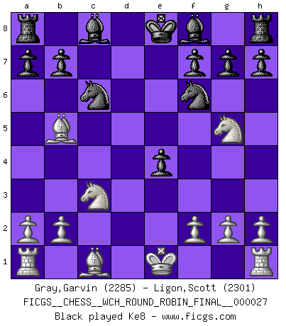 Last move : 1/2-1/2 2025 August 31 12:5:44 [Event "FICGS__CHESS__WCH_ROUND_ROBIN_FINAL__000027"] [Site "FICGS"] [Date "2025.07.21"] [Round "1"] [White "Gray,Garvin"] [Black "Ligon,Scott"] [Result "1/2-1/2"] [WhiteElo "2285"] [BlackElo "2301"] 1.d4 d5 2.Nf3 Nf6 3.c4 e6 4.Nc3 c5 5.cxd5 cxd4 6.Qxd4 exd5 7.e4 Nc6 8.Bb5 dxe4 9.Qxd8+ Kxd8 10.Ng5 Ke8 11.O-O Bf5 12.Re1 Bb4 13.Bd2 h6 14.Nf3 Kf8 15.Bxc6 Bxc3 16.Bxc3 bxc6 17.Nd4 Bd7 18.Rac1 Kg8 19.Nxc6 Bxc6 20.Bxf6 Bd5 21.Bc3 1/2-1/2 Follow this game move after move (download)No Chess Grandmaster is normal; they only differ in the extent of their madness. (Viktor Korchnoi) Ja, jede Frau in Holland liebt mich bestimmt, und alle Männer hassen mich. (Loek van Wely) Debió haber existido una vez en que los hombres eran semidióses, de otra manera no hubiesen podido inventar el Ajedrez. (Gustav Schenk) Les échecs sont plus proches de l'art de l'assassinat que de l'art de la guerre. (Arturo Perez-Reverte) A government big enough to give you everything you want is strong enough to take everything you have. (Thomas Jefferson)