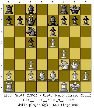 Last move : 1-0 2025 July 28 15:39:26 [Event "FICGS__CHESS__RAPID_M__000171"] [Site "FICGS"] [Date "2025.07.23"] [Round "1"] [White "Ligon,Scott"] [Black "Cleto Junior,Dirceu"] [Result "1-0"] [WhiteElo "2301"] [BlackElo "2111"] 1.e4 d6 2.d4 Nf6 3.Nc3 e6 4.f4 Be7 5.Nf3 O-O 6.Bd3 c5 7.dxc5 dxc5 8.Bd2 Nc6 9.e5 Nd5 10.O-O Ncb4 11.Be2 Nxc3 12.bxc3 Nc6 13.Qe1 Qc7 14.Qg3 Rb8 15.Bd3 b5 16.Be3 c4 17.Be4 a5 18.Rae1 g6 19.h4 Bb7 20.f5 1-0 Follow this game move after move (download)One of these modest little moves may be more embarrassing to your opponent than the biggest threat. (Siegbert Tarrasch) Modernes Schach erfordert enorme Anspannung. Es ist für einen normalen Menschen unmöglich das auszuhalten. (Viktor Kortschnoi) La táctica fluye a partir de una posición superior. (Bobby Fischer) Je crois qu'il existe des manières très spécifiques de jouer efficacement contre une machine. Evidemment, nous n'avons aucune chance en technique pure, parce que l'ordinateur calcule de manière parfaite. Mais lorsque nous faisons appel à notre cerveau, en utilisant l'intuition et la compréhension, alors nous restons beaucoup plus forts. (Anatoli Karpov) For peace of mind, resign as general manager of the universe. (Douglas Adams)