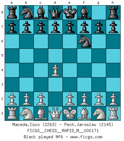 Last move : exd4 2026 January 27 2:36:1 White clock - 3 days 23:26:08 Black clock - 0 day 17:09:52 [Event "FICGS__CHESS__RAPID_M__000171"] [Site "FICGS"] [Date "2025.07.23"] [Round "1"] [White "Maceda,Coco"] [Black "Pech,Jaroslav"] [Result "*"] [WhiteElo "2263"] [BlackElo "2145"] 1.d4 Nf6 2.c4 g6 3.g3 c6 4.Bg2 d5 5.cxd5 cxd5 6.Nf3 Bg7 7.Nc3 O-O 8.O-O Ne4 9.Nd2 Nxd2 10.Qxd2 Nc6 11.e3 e6 12.b3 Qa5 13.a4 Bd7 14.Ba3 Rfc8 15.Rfd1 Qd8 16.h4 h5 17.Rac1 Qb6 18.Bc5 Qd8 19.Qe1 Ne7 20.Ba3 Nf5 21.Bf1 Nh6 22.Ne2 Ng4 23.Nf4 Qb6 24.Qb4 Qxb4 25.Bxb4 Bf8 26.Bxf8 Kxf8 27.Be2 Nf6 28.f3 a5 29.Bd3 Ke7 30.Kf2 Kd6 31.Ra1 Rc3 32.Rdb1 e5 33.dxe5+ Kxe5 34.Ke2 Kd6 35.Ra2 Re8 36.Kd2 Rc5 37.Rab2 Rec8 38.b4 axb4 39.Rxb4 Ra5 40.Rxb7 Rxa4 41.R1b6+ Rc6 42.Ne2 Rxb6 43.Rxb6+ Ke7 44.Ke1 Ra1+ 45.Kf2 Ne8 46.Ra6 Rxa6 47.Bxa6 Nc7 48.Bd3 Bb5 49.Bxb5 Nxb5 50.Nf4 Kd6 51.g4 hxg4 52.fxg4 Nc3 53.Nd3 Ne4+ 54.Kf3 Ke6 55.Kf4 f6 56.g5 fxg5+ 57.hxg5 Kd6 58.Kg4 d4 59.exd4 * Follow this game move after move (download)If cunning alone were needed to excel, women would be the best Chess players. (Albin) Zeige mir drei Eröffnungsvarianten und ich beweise dir, dass zwei davon inkorrekt sind. (Emanuel Lasker) Debió haber existido una vez en que los hombres eran semidióses, de otra manera no hubiesen podido inventar el Ajedrez. (Gustav Schenk) Assurément je connaissais par expérience le mystérieux attrait de ce jeu royal, le seul entre tous les jeux inventés par les hommes qui échappe souverainement à la tyrannie du hasard, le seul où l'on ne doive sa victoire qu'à son intelligence ou plutôt à une certaine forme d'intelligence. Mais n'est-ce pas déjà le limiter injurieusement que d'appeler les échecs un jeu ? N'est-ce pas une science, un art ou quelque chose qui, comme le cercueil de Mahomet entre ciel et terre, est suspendu entre l'un et l'autre, et qui réunit un nombre incroyable de contraires ? [...] C'est une pensée qui ne mène à rien, une mathématique qui n'établit rien, un art qui ne laisse pas d'uvre, une architecture sans matière; et il l'a prouvé néanmoins qu'il était plus durable, à sa manière, que les livres ou que tout autre monument, ce jeu unique qui appartient à tous les peuples et à tous les temps, et dont personne ne sait quel dieu en fit don à la terre pour tuer l'ennui, pour aiguiser l'esprit et stimuler l'âme. Où commence-t-il, où finit-il ? (Stefan Zweig) The Internet is so big, so powerful and pointless that for some people it is a complete substitute for life. (Andrew Brown)