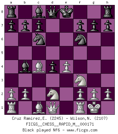 Last move : 1-0 2025 September 26 7:4:4 [Event "FICGS__CHESS__RAPID_M__000171"] [Site "FICGS"] [Date "2025.07.23"] [Round "1"] [White "Cruz Ramirez,Eliecer"] [Black "Wilson,Norman"] [Result "1-0"] [WhiteElo "2245"] [BlackElo "2107"] 1.d4 d5 2.c4 dxc4 3.e4 e5 4.Nf3 exd4 5.Bxc4 Bb4+ 6.Nbd2 Nc6 7.O-O Nf6 8.e5 Nd7 9.e6 fxe6 10.Bxe6 Nb6 11.Bb3 Bf5 12.Re1+ Kf8 13.a3 Ba5 14.Ba2 Nd7 15.b4 Bb6 16.b5 Ne7 17.a4 Nc5 18.Ba3 Ke8 19.a5 Rf8 20.Nb3 Ne4 21.axb6 axb6 22.Bxe7 Qxe7 23.Nbxd4 Rd8 24.Qa4 g6 25.Ne6 Bxe6 26.Qxe4 Rd6 27.Bxe6 Rxe6 28.Qxe6 Qxe6 29.Rxe6+ Kd7 30.Ng5 Rd8 31.Rd1+ Kc8 32.Rxd8+ Kxd8 33.Nxh7 c6 34.bxc6 bxc6 35.Rxc6 1-0 Follow this game move after move (download)The tactician knows what to do when there is something to do; whereas the strategian knows what to do when there is nothing to do. (Gerald Abrahams) Es ist im Leben wie im Schachspiel. Wir entwerfen einen Plan, dieser bleibt jedoch bedingt durch das, was im Schachspiel dem Gegner, im Leben dem Schicksal zu tun belieben wird. (Arthur Schopenhauer) Con el tiempo, empecé a progresar en partidas decisivas. Tal vez porque me di cuenta de una simple verdad: no solo estaba yo nervioso sino también mi oponente. (Mikhail Tal) Lorsque vous vous retrouvez devant une position atroce, ne tendez pas un ultime piège dérisoire avec l'intention d'abandonner si l'adversaire le déjoue ! Faites-vous plutôt un devoir de résister comme si votre vie en dépendait. Jouez le coup qui vous déplairait au centuple si vous étiez dans la peau de votre tortionnaire ! Go and wake up your luck. (Persian saying)