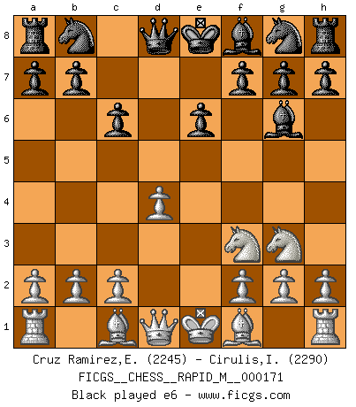 Last move : 1/2-1/2 2025 September 1 9:23:26 [Event "FICGS__CHESS__RAPID_M__000171"] [Site "FICGS"] [Date "2025.07.23"] [Round "1"] [White "Cruz Ramirez,Eliecer"] [Black "Cirulis,Ilmars"] [Result "1/2-1/2"] [WhiteElo "2245"] [BlackElo "2290"] 1.e4 c6 2.d4 d5 3.Nc3 dxe4 4.Nxe4 Bf5 5.Ng3 Bg6 6.Nf3 e6 7.h4 h6 8.Ne5 Bh7 9.Bd3 Bxd3 10.Qxd3 Nd7 11.f4 Be7 12.Bd2 Nxe5 13.fxe5 Bxh4 14.O-O-O Bxg3 15.Qxg3 Ne7 16.Qxg7 Rg8 17.Qxh6 Qd5 18.Kb1 O-O-O 19.Qf6 Nf5 20.Rh7 Qxd4 21.Qxf7 Qd7 22.Qxd7+ Rxd7 23.Rxd7 1/2-1/2 Follow this game move after move (download)I still hope to kill Fischer. (Boris Spassky) Kasparov stellt für gewöhnlich die Regeln auf und bricht sie dann selbst wieder. (Alexej Shirov) La captura del Rey enemigo es la finalidad pero no el primer objetivo de la partida. (William Steinitz) Il vaut toujours mieux jouer un plan faux de façon logique que de n'avoir pas de plan du tout. (Victor Kortchnoï) When you stop learning you start dying. (M. Scott Adams)