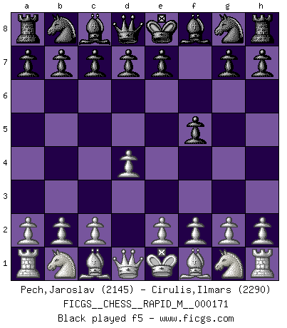 Last move : 0-1 2025 October 10 2:35:22 [Event "FICGS__CHESS__RAPID_M__000171"] [Site "FICGS"] [Date "2025.07.23"] [Round "1"] [White "Pech,Jaroslav"] [Black "Cirulis,Ilmars"] [Result "0-1"] [WhiteElo "2145"] [BlackElo "2290"] 1.d4 f5 2.c4 d6 3.Nf3 g6 4.g3 Nf6 5.Bg2 Bg7 6.O-O O-O 7.Nc3 c6 8.d5 e5 9.dxe6 Bxe6 10.b3 Ne4 11.Nxe4 fxe4 12.Nd4 Qd7 13.Bxe4 Bh3 14.Re1 Na6 15.Rb1 Qf7 16.Bf3 Rae8 17.Nc2 Nc5 18.Be3 Re6 19.Qd2 g5 20.Rbd1 Rf6 21.Nd4 g4 22.Bh1 Rxf2 23.Bf4 Nd3 24.Ne6 Bd4 25.Nxd4 Nxf4 26.Kxf2 Ng2 27.Nf3 gxf3 28.Qg5+ Kh8 29.e4 Qe6 30.Qd2 Nxe1 31.Rxe1 Bg4 32.Re3 Kg8 33.Qc3 Qh6 0-1 This chess game has been lost on time (started : 2025.07.23 11:23:53) Follow this game move after move (download)On the chessboard, lies and hypocrisy do not survive long. (Emanuel Lasker) Stelle das Brett so, daß die Sonne in die Augen deines Gegners scheint. (Ruy López) A la fecha, Fischer esta simplemente un nivel arriba de todos los mejores jugadores de Ajedrez del mundo. (John Jacobs) Toute estimation doit être constamment réévaluée. (Jacob Estrin) Inventor: A person who makes an ingenious arrangement of wheels, levers and springs, and believes it civilization. (Ambrose Bierce, The Devil's Dictionary)