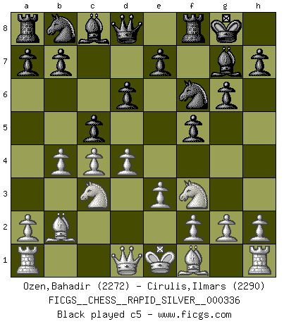 Last move : 1/2-1/2 2025 August 7 17:52:4 [Event "FICGS__CHESS__RAPID_SILVER__000336"] [Site "FICGS"] [Date "2025.07.23"] [Round "1"] [White "Ozen,Bahadir"] [Black "Cirulis,Ilmars"] [Result "1/2-1/2"] [WhiteElo "2272"] [BlackElo "2290"] 1.d4 f5 2.Nf3 Nf6 3.c4 g6 4.Nc3 Bg7 5.b4 O-O 6.e3 d6 7.Bb2 c5 8.a3 e5 9.dxe5 dxe5 10.Nxe5 Qxd1+ 11.Rxd1 Nc6 12.Nxc6 bxc6 13.b5 cxb5 14.cxb5 Be6 15.Rc1 c4 16.Na4 Rfc8 17.Bd4 Nd7 18.Be2 Rab8 19.Bxg7 Kxg7 20.Nc3 1/2-1/2 Follow this game move after move (download)The only thing Chess players have in common is Chess. (Lodewijk Prins) Ich bewundere Kasparows phantasievolle Angriffssiege aus den Achtzigern und Neunzigern, aber wenn man sie mit dem Computer überprüft, nimmt der Computer in jeder zweiten Partie die Opfer an, verteidigt sich und gewinnt. (Vladimir Kramnik) Muchos jugadores de Ajedrez se sorprendían cuando después de la partida, Fischer explicaba con calma: 'Yo ya había analizado esta posibilidad' en una posición en la cual yo creía que no era posible de prever desde la apertura. (Mikhail Tal) Soyez une menace à chaque fois que vous vous asseyez pour jouer. (Ken Smith) Your best chance to get a Royal Flush in a casino is in the bathroom. (Anonymous)