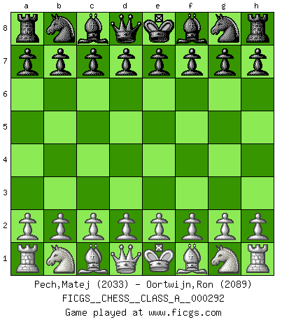 Last move : Rf8 2026 January 3 18:26:12 Matej Pech ... is in vacation until 2026 February 1 3:5:27 White clock - 14 days 19:54:40 Black clock - 100 days 00:00:00 [Event "FICGS__CHESS__CLASS_A__000292"] [Site "FICGS"] [Date "2025.07.24"] [Round "1"] [White "Pech,Matej"] [Black "Oortwijn,Ron"] [Result "*"] [WhiteElo "2033"] [BlackElo "2089"] 1.d4 f5 2.c4 Nf6 3.Nc3 e6 4.Nf3 Bb4 5.Bd2 b6 6.g3 Bb7 7.Bg2 O-O 8.O-O Bxc3 9.Bxc3 Ne4 10.Qc2 d6 11.Ne1 c5 12.Rd1 Qe7 13.Bxe4 fxe4 14.Ng2 Na6 15.dxc5 bxc5 16.Ne3 Rad8 17.Qa4 Qe8 18.Qa3 Qf7 19.Ba5 Rd7 20.b4 cxb4 21.Bxb4 Nxb4 22.Qxb4 Rfd8 23.Qa4 Ba8 24.Rd2 h6 25.Rfd1 Qf6 26.Qb5 d5 27.cxd5 exd5 28.Nxd5 Bxd5 29.Rxd5 Rxd5 30.Rxd5 Rf8 31.* Follow this game move after move (download)The passed Pawn is a criminal, who should be kept under lock and key. Mild measures, such as police surveillance, are not sufficient. (Aaron Nimzovich) Kleine Schachspieler machen Mist, und große Schachspieler machen Mist, aber große machen weniger Mist. (Fritz Sämisch) Preferería tener un Peón que un dedo. (Reuben Fine) Vous n'êtes pas toujours obligé de jouer le meilleur coup. Un coup doit être actif, entreprenant, correct et beau ! (David Bronstein) Secret operations are essential in war; upon them the army relies to make its every move. (Sun Tzu)