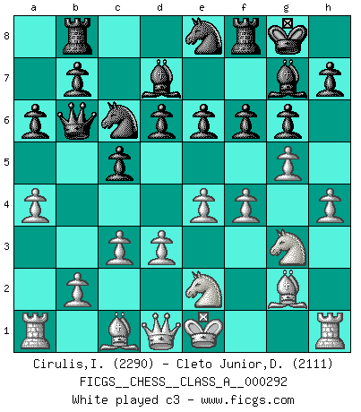 Last move : 1-0 2025 July 29 17:4:50 [Event "FICGS__CHESS__CLASS_A__000292"] [Site "FICGS"] [Date "2025.07.24"] [Round "1"] [White "Cirulis,Ilmars"] [Black "Cleto Junior,Dirceu"] [Result "1-0"] [WhiteElo "2290"] [BlackElo "2111"] 1.e4 c5 2.Nc3 Nc6 3.Nge2 Nf6 4.g3 g6 5.Bg2 Bg7 6.d3 d6 7.f4 O-O 8.a4 a6 9.h3 Rb8 10.g4 e6 11.g5 Ne8 12.Ng3 Bd7 13.h4 f6 14.Nce2 Qb6 15.c3 Rc8 16.f5 exf5 17.exf5 Nc7 18.O-O fxg5 19.Bxg5 gxf5 20.Nh5 Be5 21.Rf2 Rf7 22.Nef4 Rcf8 23.Nd5 Qa5 24.d4 cxd4 25.b4 1-0 Follow this game move after move (download)If you aren't afraid of Spassky, then I have removed the element of money. (Jim Slater) Wenn sie aufgeben, dann danke ich Ihnen für das Spiel (Eventualzug beim Fernschach). (Anonymous) La pasion por jugar al Ajedrez es una de las mas inexplicables en el mundo. (H.G. Wells) Les échecs sont plus proches de l'art de l'assassinat que de l'art de la guerre. (Arturo Perez-Reverte) All men can see these tactics whereby I conquer, but what none can see is the strategy out of which victory is evolved. (Sun Tzu)