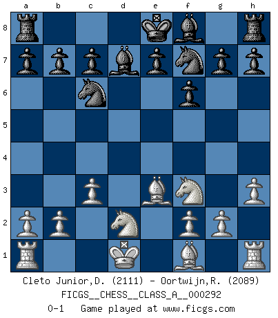 Last move : 0-1 2025 July 27 20:25:49 [Event "FICGS__CHESS__CLASS_A__000292"] [Site "FICGS"] [Date "2025.07.24"] [Round "1"] [White "Cleto Junior,Dirceu"] [Black "Oortwijn,Ron"] [Result "0-1"] [WhiteElo "2111"] [BlackElo "2089"] 1.e4 d6 2.d4 Nf6 3.e5 dxe5 4.dxe5 Qxd1+ 5.Kxd1 Ng4 6.Be3 Nxe5 7.Nd2 Bd7 8.h3 Nbc6 9.c3 f6 10.Ngf3 Nf7 0-1 Follow this game move after move (download)Daring ideas are like Chess men moved forward. They may be beaten, but they may start a winning game. (Johann Wolfgang von Goethe) Die Fehler sind da, Sie warten nur darauf gemacht zu werden. (Savielly Grigorievitsch Tartakower) No puedes jugar al Ajedrez si eres de corazón noble. (Proverbio Francés) Je ne suis pas le dernier à jouer lâchement des coups douteux pendant le zeïtnot de l'adversaire pour l'achever: en effet les coups qui font le plus peur sont ceux que l'on ne comprend pas. Je me fais souvent peur quand je joue. (Un professeur anonyme) Chess is as much a mystery as women. (Purdy)