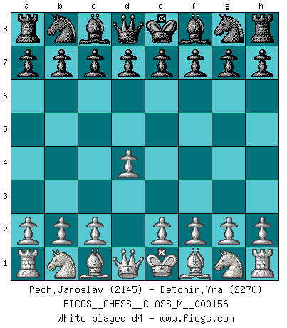Last move : fxe4 2026 January 29 5:33:45 White clock - 30 days 07:37:42 Black clock - 100 days 00:00:00 [Event "FICGS__CHESS__CLASS_M__000156"] [Site "FICGS"] [Date "2025.07.30"] [Round "1"] [White "Pech,Jaroslav"] [Black "Detchin,Yra"] [Result "*"] [WhiteElo "2145"] [BlackElo "2270"] 1.d4 Nf6 2.c4 g6 3.Nc3 Bg7 4.e4 d6 5.Nf3 O-O 6.Be2 e5 7.dxe5 dxe5 8.Qxd8 Rxd8 9.Bg5 Re8 10.Nd5 Nxd5 11.cxd5 c6 12.Bc4 cxd5 13.Bxd5 Nd7 14.Nd2 Nc5 15.O-O-O Be6 16.Bxe6 Nxe6 17.Be3 f5 18.f3 Rac8+ 19.Kb1 b6 20.Rc1 Bf6 21.Rxc8 Rxc8 22.a4 h5 23.Rc1 Rd8 24.Nc4 Kg7 25.a5 bxa5 26.Bxa7 a4 27.Bb6 Rc8 28.Be3 Rb8 29.Ka2 h4 30.Rc3 fxe4 31.* Follow this game move after move (download)Chess demands total concentration. (Bobby Fischer) Ich kenne Menschen, die allen Willen der Welt besitzen und doch nicht Schach spielen können. (Robert James Fischer) Robert Fischer es la ley hacia si mismo. (Larry Evans) Karpov est une pièce de musée. (Garry Kasparov) If you ain't just a little scared when you enter a casino, you are either very rich or you haven't studied the games enough. (Pappy)