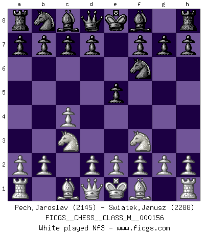 Last move : Nxc6 2026 January 16 19:46:56 White clock - 22 days 16:56:21 Black clock - 100 days 00:00:00 [Event "FICGS__CHESS__CLASS_M__000156"] [Site "FICGS"] [Date "2025.07.30"] [Round "1"] [White "Pech,Jaroslav"] [Black "Swiatek,Janusz"] [Result "*"] [WhiteElo "2145"] [BlackElo "2288"] 1.c4 e5 2.Nc3 Nf6 3.Nf3 Nc6 4.g3 Bb4 5.Bg2 O-O 6.O-O e4 7.Ne1 Bxc3 8.dxc3 h6 9.Nc2 d6 10.Ne3 a5 11.Qc2 Re8 12.Bd2 a4 13.Rfe1 b6 14.b3 Ra5 15.b4 Ra7 16.b5 Ne5 17.Bxe4 Nxe4 18.Qxe4 a3 19.Rab1 Be6 20.f3 Qa8 21.Qd4 Qc8 22.Nd5 Ra4 23.Rb4 Ra8 24.R4b1 Ra4 25.Rb4 Ra7 26.Rb3 Ra5 27.R3b1 Bf5 28.Rb3 Be6 29.R3b1 c5 30.bxc6 Nxc6 31.* Follow this game move after move (download)Chess is above all, a fight ! (Emanuel Lasker) Ein Kibitz ist einer, der deinem Gegner gute Ratschläge gibt. (Andrew Soltis) No es una movida, aún la mejor movida que tu debas buscar, sino un plan comprensible. (Eugene Znosko-Borovsky) Le génie consiste à savoir transgresser les règles au moment opportun. (Teichmann) Lottery : A tax on people who are bad at math. (Author unknown)