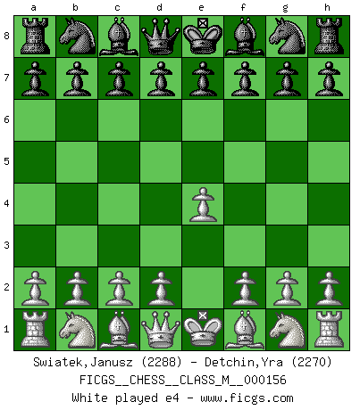 Last move : Kc3 2026 February 5 9:22:59 White clock - 97 days 03:41:33 Black clock - 80 days 21:01:17 (54 days 03:58:09) [Event "FICGS__CHESS__CLASS_M__000156"] [Site "FICGS"] [Date "2025.07.30"] [Round "1"] [White "Swiatek,Janusz"] [Black "Detchin,Yra"] [Result "*"] [WhiteElo "2288"] [BlackElo "2270"] 1.e4 d6 2.d4 Nf6 3.Nc3 g6 4.Be3 Bg7 5.Qd2 c6 6.Nf3 O-O 7.Bh6 d5 8.exd5 cxd5 9.Bxg7 Kxg7 10.Ne5 Bf5 11.f3 h5 12.O-O-O Nc6 13.h4 Qd6 14.Qe3 Rac8 15.Kb1 a6 16.g4 hxg4 17.h5 Rh8 18.h6+ Kf8 19.Bd3 Bxd3 20.cxd3 gxf3 21.Rde1 Nxe5 22.dxe5 d4 23.Qxf3 Qc6 24.Qxc6 Rxc6 25.exf6 dxc3 26.Rxe7 c2+ 27.Kc1 Rxf6 28.Rxb7 Rh7 29.Rb8+ Ke7 30.Rb7+ Kf8 31.Rb8+ Ke7 32.Rg8 Rc6 33.d4 f5 34.d5 Rd6 35.Kxc2 Kf6 36.Rc8 g5 37.b4 g4 38.Rc6 Ke7 39.Re1+ Kd7 40.Re6 Rxc6+ 41.Rxc6 g3 42.Rxa6 g2 43.Rg6 Rxh6 44.Rxg2 Kd6 45.Kc3 * Follow this game move after move (download)Dazzling combinations are for the many, shifting wood is for the few. (Georg Kieninger) Das Schach hält seine Meister in eigenen Banden, Fesseln; auf vielerlei Weise formt es ihren Geist, so dass die innere Freiheit selbst des Stärksten beeinflusst wird. (Albert Einstein) Aquel que ve no otra dirección en el juego que la de dar Jaque Mate a su oponente, nunca será un buen jugador de Ajedrez. (Euwe) Horreur, mais aussi harmonie suprême : qu'y avait-il en effet au monde en dehors des échecs ? Le brouillard, l'inconnu, le non-être... (Vladimir Nabokov) You can't play chess if you're groggy from pills. (Anatoly Karpov)