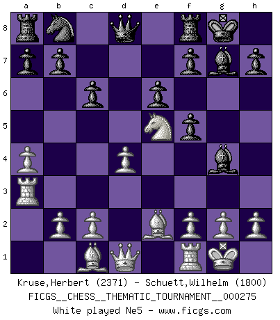 Last move : 1-0 2025 November 16 18:6:7 [Event "FICGS__CHESS__THEMATIC_TOURNAMENT__000275"] [Site "FICGS"] [Date "2025.08.01"] [Round "1"] [White "Kruse,Herbert"] [Black "Schuett,Wilhelm"] [Result "1-0"] [WhiteElo "2371"] [BlackElo "1800"] 1.e4 c6 2.d4 d5 3.Nc3 dxe4 4.Nxe4 Nf6 5.Nxf6+ gxf6 6.Nf3 Bg4 7.Be2 Bg7 8.O-O O-O 9.a4 f5 10.Ra3 e6 11.Ne5 Bxe2 12.Qxe2 Qxd4 13.Rg3 f4 14.Rxg7+ Kxg7 15.Rd1 Qxa4 16.Qg4+ Kh8 17.Nxf7+ Rxf7 18.Rd8+ 1-0 Follow this game move after move (download)War is the child of passion, passion is the child of narcissism and narcissism is the child. (...) Another game ? (Thibault de Vassal) Obwohl ich alt bin, darf mir niemand den Finger in den Mund stecken, sonst beisse ich. (Wilhelm Steinitz) Aquel que toma al Peón de Caballo de la Reina, se pasará la noche a dormir en la calle. (Anónimo) Tous ces prétendus hommes politiques sont les pions, les Cavaliers, les Tours ou les Fous d'une partie d'échecs qui se jouera tant qu'un hasard ne renversera pas l'échiquier. (Honoré de Balzac) Fortune favours the audacious. (Desiderius Erasmus)