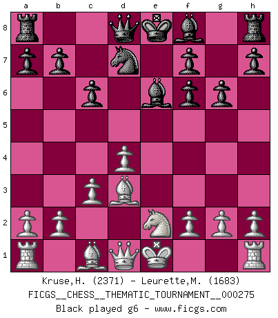 Last move : 1-0 2025 September 13 20:59:5 [Event "FICGS__CHESS__THEMATIC_TOURNAMENT__000275"] [Site "FICGS"] [Date "2025.08.01"] [Round "1"] [White "Kruse,Herbert"] [Black "Leurette,Marc-Antoine"] [Result "1-0"] [WhiteElo "2371"] [BlackElo "1683"] 1.e4 c6 2.d4 d5 3.Nc3 dxe4 4.Nxe4 Nf6 5.Nxf6+ exf6 6.c3 Be6 7.Bd3 Nd7 8.Ne2 g6 9.O-O Bg7 10.Re1 O-O 11.Nf4 Re8 12.Nxe6 fxe6 13.Bc4 Nf8 14.Qf3 b5 15.Bb3 a5 16.Qxc6 a4 17.Bxe6+ Nxe6 18.Rxe6 Rc8 19.Rxe8+ Qxe8 20.Qxe8+ Rxe8 21.Be3 f5 22.g3 Kf7 23.a3 Ke6 24.Kf1 Kd5 25.Rd1 h6 26.h4 h5 27.Ke2 Kc4 28.Rd2 Bf6 29.Kd1 Rg8 30.Kc2 g5 31.hxg5 Bxg5 32.Bxg5 Rxg5 33.Re2 Kd5 34.Re5+ Kc6 35.Kd3 Kb6 36.Ke2 Kc6 37.Kf3 h4 38.gxh4 Rh5 39.Kg3 f4+ 40.Kg4 1-0 Follow this game move after move (download)Chess is the gymnasium of the mind. (Blaise Pascal) Im Schach gibt es keinen Platz für Galanterie. (Irving Chernev) Aquellos que dicen entender al Ajedrez, no entienden nada. (Robert Hubner) La solitude du joueur d'Echecs à l'approche du mat est semblable à celle du condamné. (Francis Szpiner) Whoever said the pen is mightier than the sword obviously never encountered automatic weapons. (US General Douglas MacArthur)