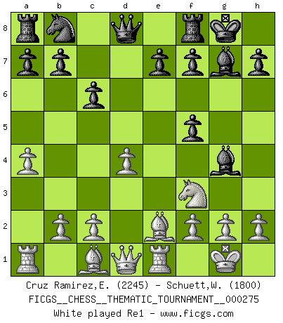 Last move : 1-0 2026 January 11 3:28:39 [Event "FICGS__CHESS__THEMATIC_TOURNAMENT__000275"] [Site "FICGS"] [Date "2025.08.01"] [Round "1"] [White "Cruz Ramirez,Eliecer"] [Black "Schuett,Wilhelm"] [Result "1-0"] [WhiteElo "2245"] [BlackElo "1800"] 1.e4 c6 2.d4 d5 3.Nc3 dxe4 4.Nxe4 Nf6 5.Nxf6+ gxf6 6.Nf3 Bg4 7.Be2 Bg7 8.O-O O-O 9.a4 f5 10.Re1 e6 11.Bg5 Qb6 12.a5 Qxb2 13.Rb1 Qa2 14.Rxb7 Qxa5 15.h3 Bxf3 16.Bxf3 Rc8 17.Bh5 f6 18.Bf7+ Kh8 19.Bxe6 Rd8 20.Bd2 Qa4 21.Qh5 Nd7 22.Bxf5 Nf8 23.Qf7 1-0 Follow this game move after move (download)A big shock; the best chess player in history has passed away. (Lajos Portisch, about Bobby Fischer's death) In Buenos Aires ist es nicht mein vorrangiges Ziel ein starkes Turnier zu organisieren, sondern ein Turnier für Gentlemen. Ich würde nie Kamsky einladen. Ich mag keine Probleme. (Miguel Najdorf) Si tu oponente no puede hacer nada activo, entonces no apures la posición; En vez de eso, dejalo estar sentado ahí, sufriendo y rogandote por un empate. (Jeremy Silman) Les échecs, c'est la lutte contre l'erreur. (Johannes Zukertort) Wisdom doesn't necessarily come with age. Sometimes age just shows up all by itself. (Tom Watson)