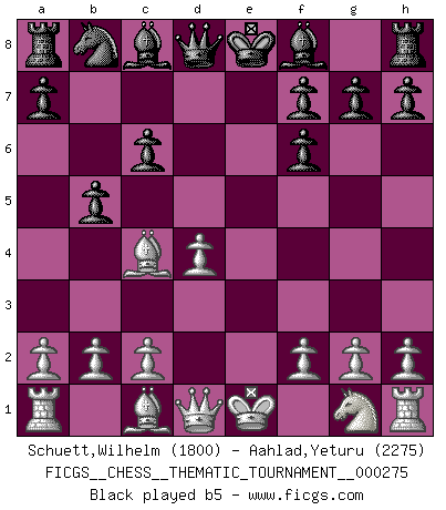 Last move : 0-1 2026 February 9 15:59:31 [Event "FICGS__CHESS__THEMATIC_TOURNAMENT__000275"] [Site "FICGS"] [Date "2025.08.01"] [Round "1"] [White "Schuett,Wilhelm"] [Black "Aahlad,Yeturu"] [Result "0-1"] [WhiteElo "1800"] [BlackElo "2275"] 1.e4 c6 2.d4 d5 3.Nc3 dxe4 4.Nxe4 Nf6 5.Nxf6+ exf6 6.Bc4 b5 7.Qe2+ Be7 8.Bxb5 Qa5+ 9.Kf1 Qxb5 10.c4 Qb6 11.c5 Qd8 12.Qe3 O-O 13.f3 f5 14.g3 Bf6 15.Kg2 Re8 16.Qd3 Ba6 17.Qxf5 Qxd4 18.h4 Nd7 19.a4 Nxc5 0-1 This chess game has been lost on time (started : 2025.08.01 21:17:5) Follow this game move after move (download)Your body has to be in top condition. Your Chess deteriorates as your body does. You can't separate body from mind. (Bobby Fischer) Ich las kürzlich ein Buch von Nietzsche. Er sagte Religion verdumme nur die Menschen. Ich stimme zu. (Robert James Fischer) Cuando tu no sabes absolutamente que mas hacer, es tiempo de entrar en pánico. (John van der Wiel) On n'a jamais que l'âge auquel on a commence à jouer aux échecs car après on cesse de vieillir. (Capablanca) Are you threatening me, Master Jedi ? (Chancellor Palpatine in Star Wars ep.3)