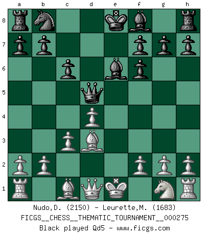 Last move : 1-0 2025 August 29 8:19:16 [Event "FICGS__CHESS__THEMATIC_TOURNAMENT__000275"] [Site "FICGS"] [Date "2025.08.01"] [Round "1"] [White "Nudo,Davide"] [Black "Leurette,Marc-Antoine"] [Result "1-0"] [WhiteElo "2150"] [BlackElo "1683"] 1.e4 c6 2.d4 d5 3.Nc3 dxe4 4.Nxe4 Nf6 5.Nxf6+ exf6 6.c3 Be6 7.Bd3 Qd5 8.Nf3 Bd6 9.Qc2 g6 10.Bd2 Nd7 11.c4 Qh5 12.h3 g5 13.O-O-O h6 14.g4 Bxg4 15.hxg4 Qxg4 16.Rhe1+ Be7 17.Re3 Kd8 18.Bf5 Qf4 19.Rxe7 Qxf3 20.Rxd7+ Ke8 21.Bb4 1-0 Follow this game move after move (download)Who is your opponent tonight, tonight I am playing against the Black pieces. (Akiba Rubinstein) Bogoljubow: Matt in vier Zügen! Tartakower: Ich verbitte mir jede Belästigung! (Savielly Grigorievitsch Tartakower) El Ajedrez, como cualquier otra actividad creativa, puede existir solo a través de méritos combinados de aquellos que tienen talento creativo y de aquellos que tienen la habilidad de organizar un trabajo creativo. (Mikhail Botvinnik) La vérité est comme le meilleur coup aux échecs : elle existe, mais il faut la chercher. (Arturo Perez-Reverte) Pretend inferiority and encourage his arrogance. (Sun Tzu)
