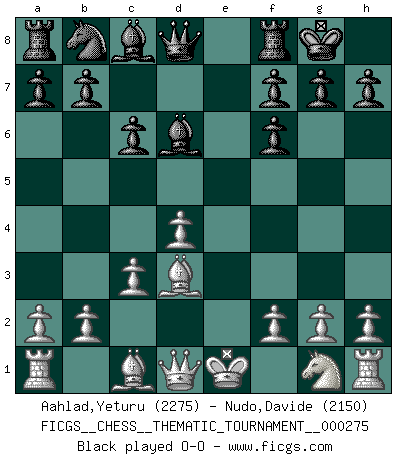 Last move : Kf3 2026 January 22 20:15:15 White clock - 100 days 00:00:00 Black clock - 90 days 08:16:44 (59 days 23:23:06) [Event "FICGS__CHESS__THEMATIC_TOURNAMENT__000275"] [Site "FICGS"] [Date "2025.08.01"] [Round "1"] [White "Aahlad,Yeturu"] [Black "Nudo,Davide"] [Result "*"] [WhiteElo "2275"] [BlackElo "2150"] 1.e4 c6 2.d4 d5 3.Nc3 dxe4 4.Nxe4 Nf6 5.Nxf6+ exf6 6.c3 Bd6 7.Bd3 O-O 8.Ne2 Re8 9.Qc2 h6 10.O-O Nd7 11.Ng3 Nb6 12.Bd2 a5 13.Rfe1 Rxe1+ 14.Rxe1 Be6 15.Bh7+ Kh8 16.Bf5 Qd7 17.Bxe6 fxe6 18.Qg6 Bf8 19.Nh5 e5 20.Nxf6 gxf6 21.Bxh6 Nd5 22.c4 Nf4 23.Qxf6+ Bg7 24.Bxg7+ Qxg7 25.Qxe5 Qxe5 26.dxe5 Nd3 27.Re4 Rf8 28.e6 Re8 29.f4 Nc5 30.Re5 Nd3 31.Rh5+ Kg7 32.f5 Kf6 33.g4 Nxb2 34.Rh7 Nxc4 35.Rxb7 Ne3 36.h3 Nd5 37.Kg2 Rh8 38.Ra7 c5 39.e7 Rc8 40.Kf3 * Follow this game move after move (download)Chess teaches you to control the initial excitement you feel when you see something that looks good and it trains you to think objectively when you're in trouble. (Stanley Kubrick) Wie, soll nun auch die Opposition abgeschafft werden? Ja, es tut mir leid, Ihnen diesen Schmerz nicht ersparen zu können. (Aaron Nimzowitsch) Me siento como si fuera una pieza en una partida de Ajedrez, cuando mi oponente me indica: esa pieza no puede ser movida. (Soren Kierkegaard) Nous sommes les pions de la mystérieuse partie d'Echecs jouée par Dieu. Il nous déplace, nous arrête, nous pousse encore, puis nous lance un à un dans la boîte du Néant. Epitaphe sur la tombe de David Janowsky (1868-1927). The real danger is not that computers will begin to think like men, but that men will begin to think like computers. (Sydney J. Harris)