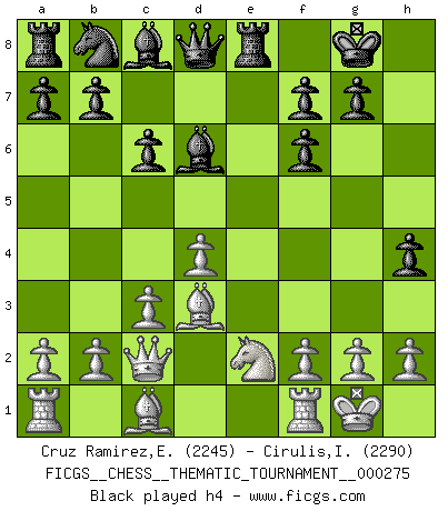 Last move : 1/2-1/2 2025 October 6 19:13:17 [Event "FICGS__CHESS__THEMATIC_TOURNAMENT__000275"] [Site "FICGS"] [Date "2025.08.01"] [Round "1"] [White "Cruz Ramirez,Eliecer"] [Black "Cirulis,Ilmars"] [Result "1/2-1/2"] [WhiteElo "2245"] [BlackElo "2290"] 1.e4 c6 2.d4 d5 3.Nc3 dxe4 4.Nxe4 Nf6 5.Nxf6+ exf6 6.c3 Bd6 7.Bd3 O-O 8.Qc2 Re8+ 9.Ne2 h5 10.O-O h4 11.h3 Nd7 12.Bh7+ Kh8 13.Bd3 Kg8 14.Be3 Nf8 15.c4 Be6 16.Rad1 Rc8 17.Nc3 Bb8 18.Rfe1 Qd6 19.f4 Ng6 20.Bxg6 fxg6 21.Qxg6 Bf7 22.Qd3 Rcd8 23.d5 Qb4 24.b3 b5 25.Kh1 a6 26.Bd2 Rxe1+ 27.Rxe1 Qf8 28.Rc1 Bc7 29.Qe3 b4 30.Ne4 1/2-1/2 Follow this game move after move (download)Chess is war over the board. The object is to crush the opponents mind. (Bobby Fischer) Stelle das Brett so, daß die Sonne in die Augen deines Gegners scheint. (Ruy López) Aquel que toma al Peón de Caballo de la Reina, se pasará la noche a dormir en la calle. (Anónimo) Il vaut mieux sacrifier les pièces de l'adversaire. (Xavier Tartacover) If passion drives you, let reason holds the reins. (Benjamin Franklin)