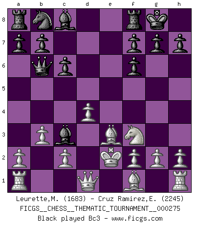 Last move : 0-1 2025 September 9 11:16:19 [Event "FICGS__CHESS__THEMATIC_TOURNAMENT__000275"] [Site "FICGS"] [Date "2025.08.01"] [Round "1"] [White "Leurette,Marc-Antoine"] [Black "Cruz Ramirez,Eliecer"] [Result "0-1"] [WhiteElo "1683"] [BlackElo "2245"] 1.e4 c6 2.d4 d5 3.Nc3 dxe4 4.Nxe4 Nf6 5.Nxf6+ exf6 6.Be3 Qb6 7.b3 Bb4+ 8.Ke2 O-O 9.Nf3 Bc3 10.Rb1 Na6 11.Qd3 Qa5 12.a4 Bf5 13.Qd1 Nb4 14.Nh4 Bxc2 15.Qc1 Qh5+ 16.f3 Rae8 17.Kf2 Rxe3 18.Qxe3 Nd5 19.Qe2 Qxh4+ 20.g3 Qxd4+ 21.Kg2 Bxb1 0-1 Follow this game move after move (download)We must make sure that Chess will not be like a dead language, very interesting, but for a very small group. (Sytze Faber) Früher wurde jeder komplizierte Zug, jedes interessante Opfer mit großem Beifall und Enthusiasmus aufgenommen. Heute schaltet man einfach seinen Fritz an, und man kann sehen, was los ist, ob der Zug geht oder nicht. (Vladimir Kramnik) Un entendimiento minucioso de las típicas continuaciones de mate hacen de las mas complicadas combinaciones de sacrificio que conducen hacia ellas no solo no dificiles, sino casi un asunto de rutina. (Siegbert Tarrasch) Les Echecs mettent en conflit, non pas deux intelligences, mais deux volontés. (Lasker) Memory is a way of holding onto the things you love, the things you are, the things you never want to lose. (from the television show: The Wonder Years)