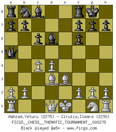 Last move : 1/2-1/2 2025 November 17 22:33:26 [Event "FICGS__CHESS__THEMATIC_TOURNAMENT__000275"] [Site "FICGS"] [Date "2025.08.01"] [Round "1"] [White "Aahlad,Yeturu"] [Black "Cirulis,Ilmars"] [Result "1/2-1/2"] [WhiteElo "2275"] [BlackElo "2290"] 1.e4 c6 2.d4 d5 3.Nc3 dxe4 4.Nxe4 Nf6 5.Nxf6+ exf6 6.Be3 Bd6 7.c4 O-O 8.Bd3 Qa5+ 9.Kf1 Re8 10.a3 Qc7 11.Ne2 f5 12.c5 Bf8 13.h4 b6 14.Bf4 Qd8 15.cxb6 axb6 16.Qc2 Bd6 17.Be3 Bb7 18.Bxf5 h6 19.g4 c5 20.Rh3 Bc7 21.Qb3 Qf6 22.Rd1 g6 23.Bb1 Bc8 24.Bxh6 Bxg4 25.Re3 Nc6 26.Bg5 Rxe3 27.Qxe3 Qd6 28.Qe4 Qd7 29.Ba2 Kg7 30.f3 Bf5 31.Qd5 Qe8 32.Bb1 Bxb1 33.Rxb1 f6 34.Bf4 Rd8 35.Qe4 Bxf4 36.Nxf4 Qxe4 37.fxe4 Nxd4 1/2-1/2 Follow this game move after move (download)Fischer is under obligation to nobody. (Joseph Platz) Man gibt nur Pakete auf. (Paul Keres) Una buena ofensiva y una buena defensa, comienzan ambas con un buen desarrollo. (Bruce A. Moon) Si je n'étais pas joueur d'échecs, je serais le meilleur dans quelque chose d'autre. (Anatoli Karpov) The Internet is the first thing that humanity has build that humanity doesn't understand, the largest experiment in anarchy that we have ever had. (Eric Schmidt)