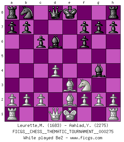 Last move : 0-1 2025 September 13 20:59:35 [Event "FICGS__CHESS__THEMATIC_TOURNAMENT__000275"] [Site "FICGS"] [Date "2025.08.01"] [Round "1"] [White "Leurette,Marc-Antoine"] [Black "Aahlad,Yeturu"] [Result "0-1"] [WhiteElo "1683"] [BlackElo "2275"] 1.e4 c6 2.d4 d5 3.Nc3 dxe4 4.Nxe4 Nf6 5.Nxf6+ exf6 6.Be3 Bd6 7.Nf3 Bg4 8.Be2 O-O 9.h3 Bf5 10.O-O Re8 11.c3 Nd7 12.Qb3 Qc7 13.Bc4 Nb6 14.a4 Nxc4 15.Qxc4 Qd7 16.b4 Bxh3 17.g3 Qg4 18.Nh2 Qe4 19.f3 Qxe3+ 20.Rf2 Bxg3 0-1 Follow this game move after move (download)Excellence at Chess is one mark of a scheming mind. (Sir Arthur Conan Doyle) Bis jetzt ist Weiß einer wohlbekannten Analyse gefolgt. Aber jetzt begeht er einen schrecklichen Fehler: Er beginnt seinen eigenen Kopf zu benutzen. (Siegbert Tarrasch) Ser exitoso en el Ajedrez te permite descubrir tu propia personalidad. Eso es lo que deseo para los niños de mi clase. (Saudin Robovic) L'attaque fait le spectacle, la défense gagne les matchs. (Dicton footballistique) Hold em is to stud what chess is to checkers. (Johnny Moss)